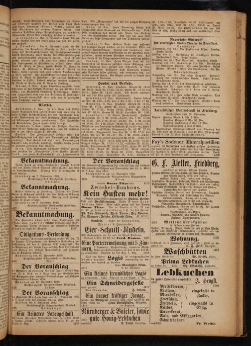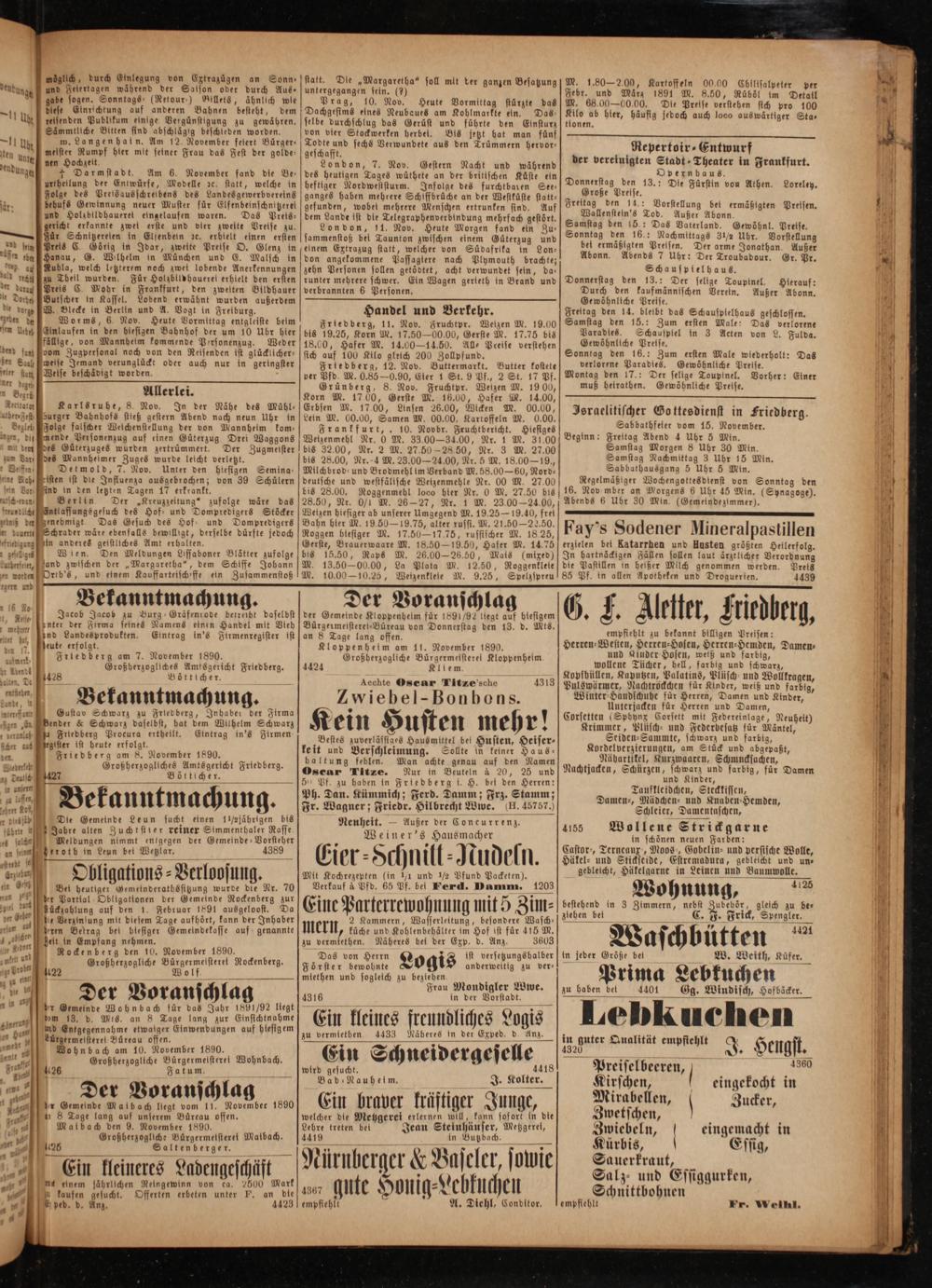 Jsraelitischer Go ttesdienst in Friedberg. Sabbathfeier vom 15. November. Beginn: Freitag Abend 4 Uhr 5 Min. Samstag Morgen 8 Uhr 30 Min. Samstag Nachmittag 3 Uhr 15 Min. Sabbathausgang 5 Uhr 5 Min. Regelmäßiger Wochengottesdienst von Sonntag den 16. Nov mber an Morgens 6 Uhr 45 Min.(Synagoge). Abends 6 Uhr 30 Min.(Gemeinde zimmer).