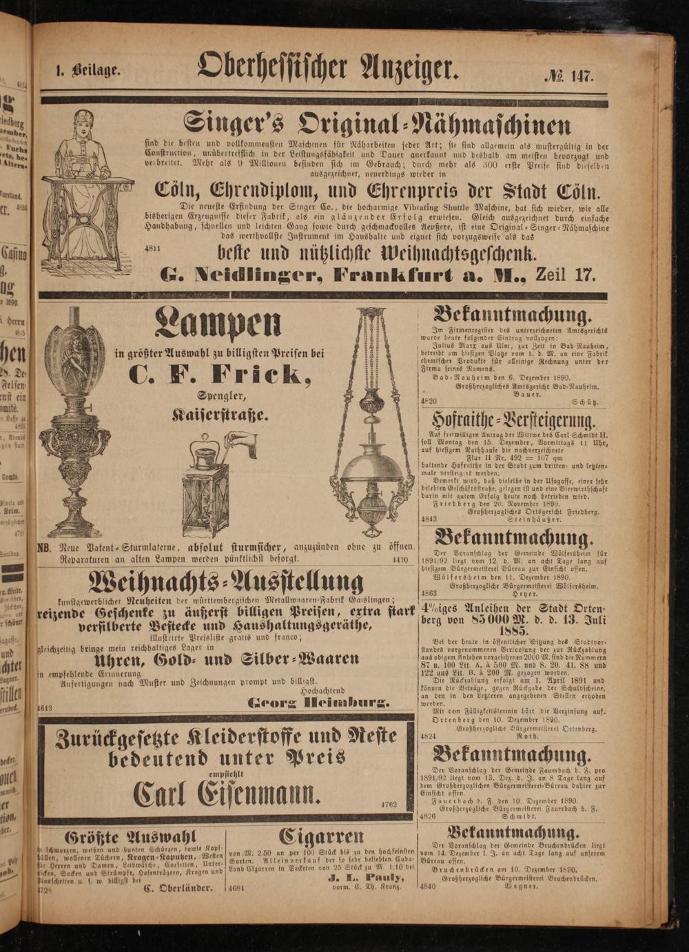 1 billi t 2 60. 9 Julius Marx aus Ulm, zur Zeit in Bad Nauheim, i 65 a u billigsten Preisen 1 betreibt am biesigen Platze vom 1. d. M. an eine Fabrik en in größter Ausw 0 5 90 P ö 9 1 ehemtscher Produkte für alleinige Rechnung unter der f D f Firma seines Namens. 8. De⸗ C. F. F T 1 C K 9 2 Bad⸗Nauheim den 6. Dezember 1890. Felsen⸗ 8 9 4 2 Großherzogliches Amtsgericht Bad-Nauheim. 1 S. Bauer. ust ein ö Spengler, 4820 Sch ü t. mite. is 8 raf PEEP C g Kaiserstraße. Hofraithe⸗Versteigerung. — 0— Auf freiwilligen Antrag der Wittwe des Carl Schmidt II. Want 0 soll Montag den 15. Dezember, Vormittags 11 Uhr, n mung auf hiesigem Rathhause die nachverzeichnete Flur II Nr. 492= 107 qm ö baltende Hofraithe in der Stadt zum dritten- und letzten⸗ male versteigent werden. Conn. Bemerkt wird, daß dieselbe in der Usagasse, einer sehr 6. belebten Geschäftsstraße, gelegen ist und eine Bierwirthschaft 1 darin mit gutem Erfolg heute noch betrieben wird. Rotie u. Friedberg den 20. November 1890. Keim. Großherzogliches Ortsgericht Friedberg. * 4843 Stein häußer.