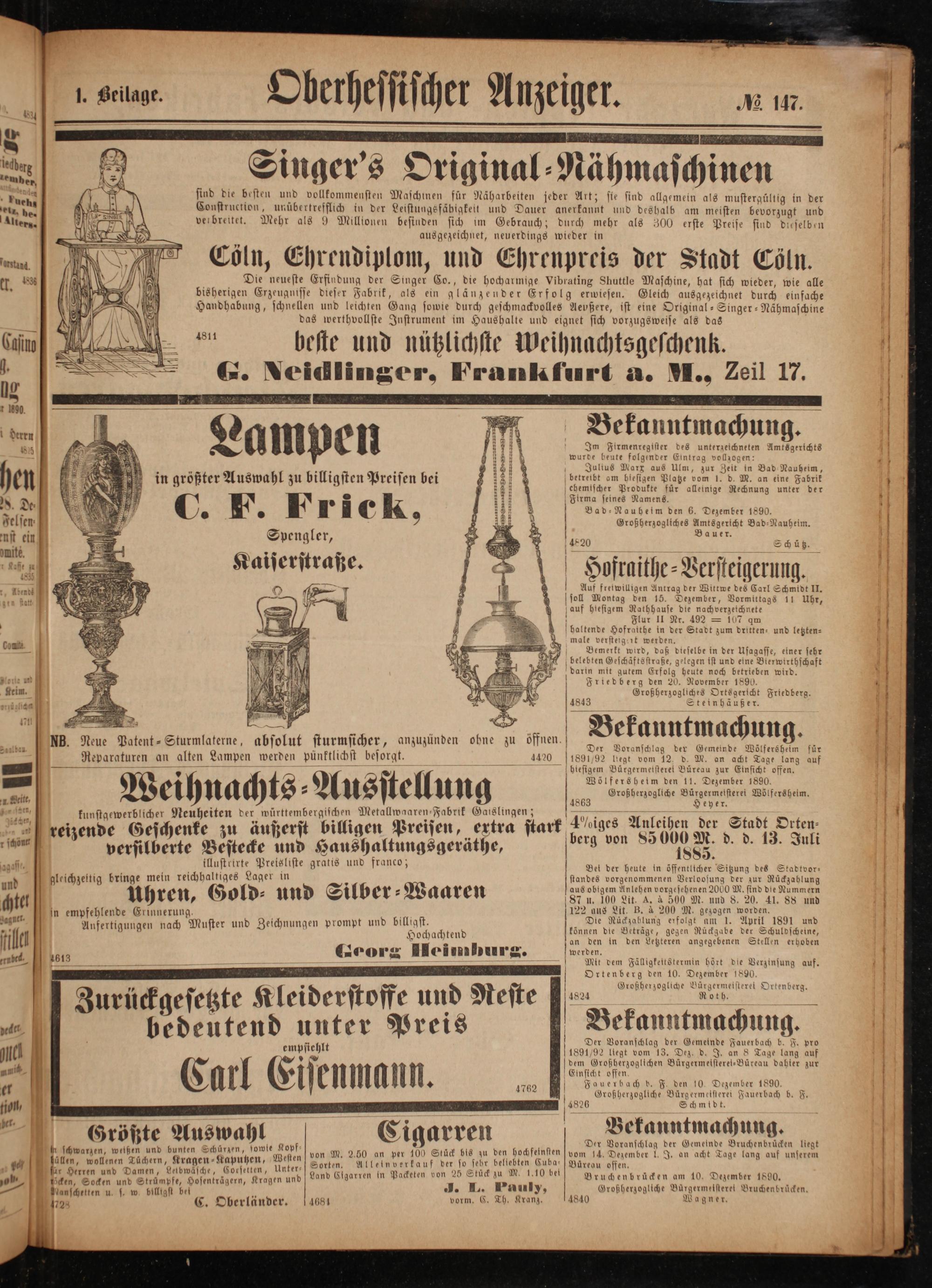 sagaf 1 f ö 9 g Bei der heute in öffentlicher Sitzung des Stadtvor— II gleichzeitig bringe mein reichhaltiges Lager in standes vorgenommenen Verloosung der zur Rückzablung und 5 f 2 15 2 aus obigem Anlehen vorgesehenen 2000 M. sind die Nummern chtel Uhren, Gold⸗ und Silber 5 Waaren 87 u. 100 Lit. A. à 500 M. und 8. 20. 41. 88 und 1 122 aus Lit. B. à 200 M. gezogen worden. In empfehlende Erinnerung. f a 8 Aurel 10 gagntt. 5 g ö C nd billigst. Die Rückzahlung erfolgt am 1. April 1891 und — 1 Aufertigungen nach Muster und Zeichnungen prompt u 85 1 in dien ee Nündet fila N 6 11* 1 an den in den Letzteren angegebenen Stellen erhoben „org IHleimburg. werden. ernbed. 1 eee ee 2 25 On 25 515 Mit dem Fälligkeitstermin hört die Verzinsung auf. 0 1 Ortenberg den 10. Dezember 1890. 55* d N Großherzogliche Bürgermeisteret Ortenberg. 4824 Roth. Zurückgesetzte Kleiderstoffe und Neste e 4 9 iter Preis Bekanntmachung ve. bedeutend unter Prei Bekanntmachung. 2 Der Voranschlag der Gemeinde Fauerbach b. F. pro empfiehlt 891/90 5 8 8 U 1891/92 liegt vom 13. Dez. d. J. an 8 Tage lang auf 28 dem Großherzoglichen Bürgermeisterei-Büreau dahier zur ani Einsicht offen N e 4 4762 Fauerbach b. F. den 10 Dezember 1890. 8 6 95 Großherzogliche Bürgermeisterei Fauerbach b. F. tion/ 1 Schmidt. .— 5 0 1 0 1 1 Größte Auswahl Cigarren Bekanntmachung. 14 N 2 le Kopf⸗ 7 Der Voranschlag der Gemeinde Bruchenbrücken liegt i schwarzen, weißen und bunten Schürzen, sowse Kop von M. 2.50 an per 100 Stück bis zu den hochfeinsten[vom 14. Dezember l. J. an acht Tage lang auf unserem 6 N Westen p 1 fällen, wollenen Tüchern, Kragen ⸗Kaputzen, Unter] Sorten. Allelnverkauf der so sebr beliebten Cuba,] Bureau offen. l e e e Land Cigarren in Packeten von 25 Stück zu M. 1.10 bei Bruchenbrücken am 10. Dezember 1890. boöcken, Socken und Strümpfe, Hosenträgern, Kra 1 f 50 1. 5* — Nianschelten u. s. wa billigst bel J. L. Pauly, Großherzogliche Bürgermeisteret Bruchenbrücken.