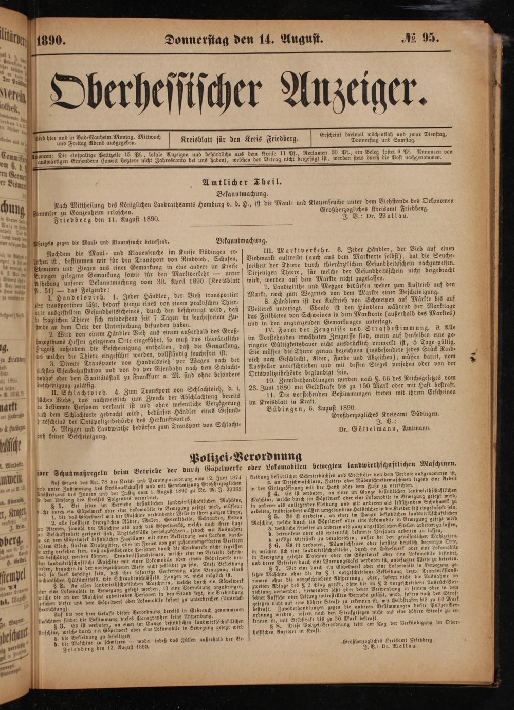 a Friedberg den 11. August 1890. 2 e ett es n mags giegeln gegen die Maul- und Klouenseuche betreffend. Bekanntmachung.