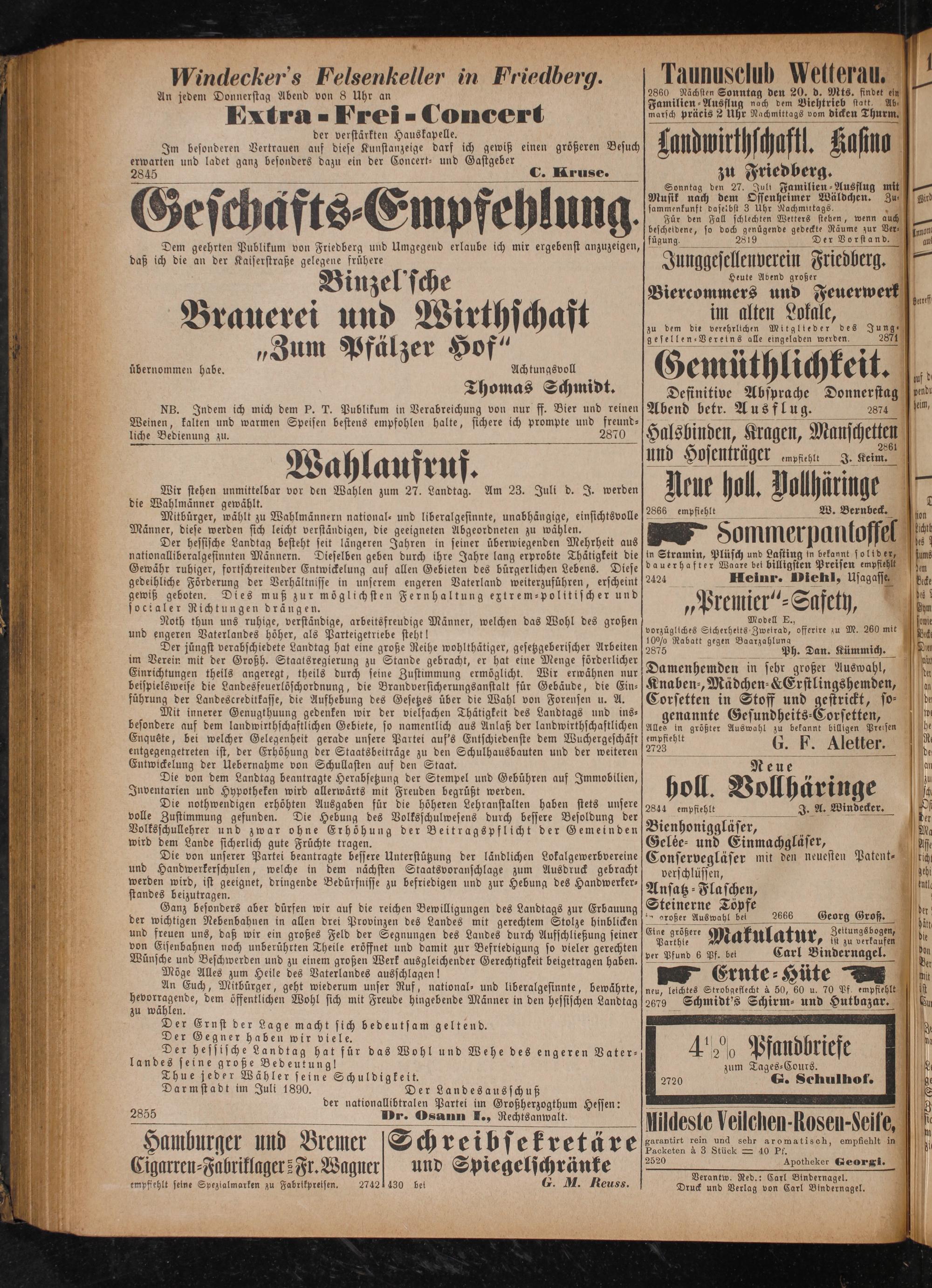 Verantw. Red.: Carl Bindernagel. Druck und Verlag von Carl Bindernagel.