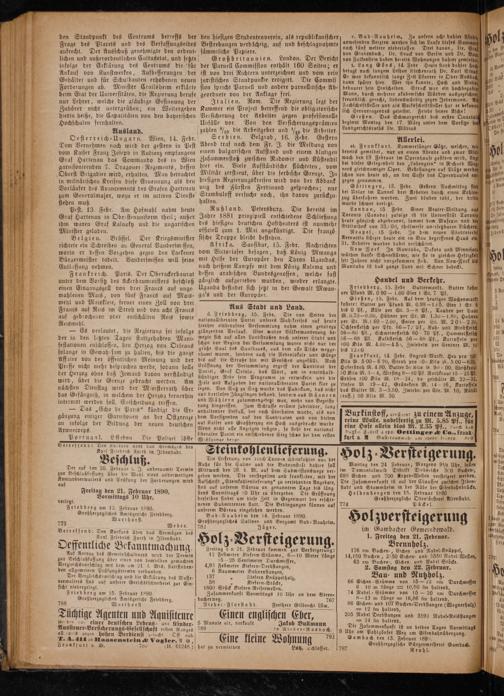 Montag den 24 Februar, Morgens 9% Uhr, sollen im Domantalwald Distrikt Diebseiche 300 Buchen-, 680 Eichen und 700 Aspen-⸗Wellen versteigert werden. Die Zusammenkunft ist auf der Chaussee zwischen Ilben stadt und Stammheim in der Näbe der Eisenbahnbrücke. Heldenbergen den 15. Februar 1890 Großherzogliche Oberförsterel Altenstadt. 774 Pückel. 1 Holzversteigerung im Gambacher Gemeindewald. l 1. Freitag den 21. Februar. Brennholz.