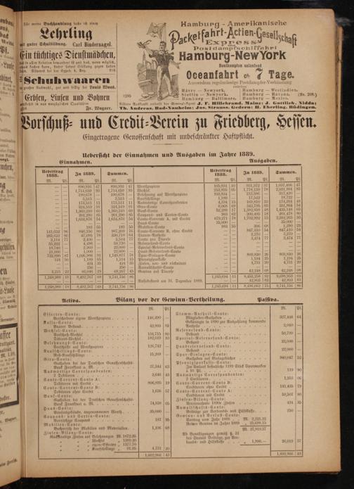 2 Vana Fu allen Arbeiten bewandert ist und das, wenn moglich, dul etpas kochen kann, findet sofort Stellung gegen hoben 0 Southampton anl 1 1 Lobn. Näperes bel der Exped. d. Anz. 916 75 Unt, Perun ren ooeanfahrt e 7 lage. 1 8. Ausserdem ret zelmässige Pos tdampfer-Verbindung 8 großer Auswahl, gut und billig bel Louis Waas. 1 zwise 1 1 N Havre— Newyork. Hambul g Festiudien. O1 N 1295 Stettin— Newyork. Hamburg— Havana.(Nr. 208. N Erbsen, Linsen und Bohnen— Hamburg zaltimore. Hamburg— Mexico. 0 10 pfiehlt in nur vorzüglichen Qualitäten Näbere Auskunft eitbeilt der General-Agent J. F. Hillehrand, Mainz: J. Gottlieb, Nidda; 118 Fr. Wagner. Th. Andreas. Bad- Nauheim: Jos. Strauss, Gedern: H. Eherling, Büdingen. N J 9 9—* J—* *—— e. 8* ** .. 4 1 f 7 . 1 2 2 1%%% 1 Eingetragene Genossenschaft mit unbeschränkter Haftpflicht. — aan Uebersicht der Einnahmen und Ausgaben im Jahre 1889. 41. 1 g Einnahmen. Ausgaben. chen,* Uebertra Uebertra 4 1889 3 In 1389. Summen. 1688. 0 In 1839. Summen. art a 0 f M. Pf. M. Pf. M. Pf. M. Pf. 9—— 890,916 47 890,916 47] Werthpapiere 105,834 10 A. Sei 1,714,659 93 1,714,659 93] Wechsel 253,855 05 . 8 190,678— 190,678 Belehnung auf Werthpapiere 103,834 ** 8. 3,513 3,513 Kaufschillinge 1,180 1—— 173511[11 173,511 11 ärtige Correspondenten 4,394 15 1— 324,519 91 324,519 91 Giro⸗Conto 8,068 69 a 1—— 1360,310 60 1,360,310 60] Bank-Conto 52,289 17 f 1—— 201,290 85 201,290 85] Coupons- und Sorten⸗Conto 983 62 200,495[18 3 5 1,634,876 54 1,634,876 54 Conto-Corrente A, mit Credit 679,271.78 1,702,992 15 —— I Haus⸗Conto 35,000— 35,000— 1 8 18355 183551 Mobilien-Conto 983 55 30668 129023 190 141,052 96 846,156 80 987,209 76] Conto⸗Corrente B, ohne Credit 84741054 847.410 54 283,622 86 17,095 78 330,718 64] Stamm-⸗Antheile 1— 3,27 0 3.270— tuttige 0 3,11477 2,400— 5,514 77 Conto pro Diverse 3,474 77 3.47477 55222 1— 15498 59,720— Reservefond-Conto 5 K 1 3 2 deli, 19,740— 2,260 22,000— Special-Reservefond-Conto—— 21000— 15000— 22,000 Haus⸗-Reservefond-Conto———— a. 722,890 87 1.026,98691 1,749,877 78] Spar-Einlagen-Conto* 809,830 26 809,830 26 — 124 50 1.189 65 131415 Pfennigsparkasse—— 119425 1.19425 * 124 35 2435 Zinsen, vor- und rückwärts— 85 4,731 20 4.731 2⁰ —— 250— 250 Anwaltschafts-Conto———— 42 en 2.22122 66,046 23 68,267 45 Gewinn auf Diverse— 42,248 08 12,248 08 len 1,248,989 18 8,492,767 68 9,741,756 86 1,245,694 117558 92 9098 950 0 u Pauset.————!] Kassebestand am 31. Dezember 1889.— 42,803 83 42.803 83 Lcd IF FI a7 68 9,711,750 806 IZI5 dd II 719 75 971175 N„„„„ 1„„* 200 7 1 2„ 11 Loot unnd Activa. Bilanz vor der Gewinn⸗ Vertheilung. Passiva. Arbeu⸗ 2 8 M. Pf. M. Pf. Effecten⸗Conto: Stamm-Antheil-Conto: netmenet. Verschiedene eigene Werth papiere 146,490 Mitglieder-Guthaben„ 327,448 64 1 Kassa⸗Conto: Gekündigte in 1890 zur Auszahlung kommende 3 1%%% ̃ͤͤ•... ᷣͤ 12,803 83 CCC 2,040— 5 9 sel-C Ro 1 5 — Wechsel⸗Conto: N Reservesond-Conto: il% ¶ AAT 134,715 80 Bestand..„ 59,720 2 ) 182,619 10] Special Reservefond Conto: tuttgart. Belehnungs⸗Conto: 85 eee. 22.000— 11 Vorschüsse auf Werthpapierrtrtre 126,742] Hausreserve fond Co nto: ali! i Kaufschillings⸗Conto: VCC(cc 22,000 N.* a enge 15,209 Spar-Einlagen-Conto: Giro⸗Conto: 8 b Guthaben auf Einlagebüch te 940,047 52 1 Guthaben bei der Deutschen Genossenschafts 1 Pfennigsp arkasse-Conto: 4. M 27,344 63 Im Umlauf Weng. 1199 Stück Sparmarken 1 Auswärtige Correspondenten: S„ 119 90 0/ 2,646 43] Auswärtige Corres p onde unten: Conto⸗Corrent-Conto A: 2 Creditoren„„ 1.95306 4 Debitoren mit Credit. 806,895 19 Conto-Corrent⸗Co nto 5. Conto⸗Corrent⸗Conto B: Creditoren ohne Credit 141,435 79 eie kredit 15636 57 Conto-Corrent-Conto A: 5 3 1 Bank⸗Conto: Creditoren mit Credie 59,507 80 Guthaben bei der Deutschen u d e 5 25 Zinsen-Bilanz Conto: Bank Frankfurt a. M.. 74,838 05 Vereinnahmte 1890r Zinsen 12435 Haus ⸗Conto: AnwaltschaftsConto: t, Vereinsgebäude, angenommener Werth... 35,000 Beiträge zur Verbands- und Hilfskasse... 250 1ct Coupons und Sorten⸗Conto: Gewinn- und Verlust Conto: Ses Vorräthige Coupons 18795 Vortrag vom Jahr 1888.. M. 2,221.22 Mobilien-Conto: Reiner Gewinn im Jahre 1889„ 25,698.15 1 Buchwerth der Mobilien und Materialien.. 1,106 68 M 77910057 1 Zinsen-Bilanz⸗Conto: Ab Be. mäß 8. 81. l 14 90* M. 1872.35 8 Bewilligungen gemaß F. 3 Rückständige Zinsen auf A M. 1872. des Statuts Beiträge, zur Ver ö N„ 1 2 1 ds d Hilfskasse 1900. 26.019[37 7 1„eigene Effecten, g bands- und Hilfskasse. f 6,019[3„ 1 7„ Kaufschillinge„ 91.95 73120 1.602.966 43 1.602.966 43