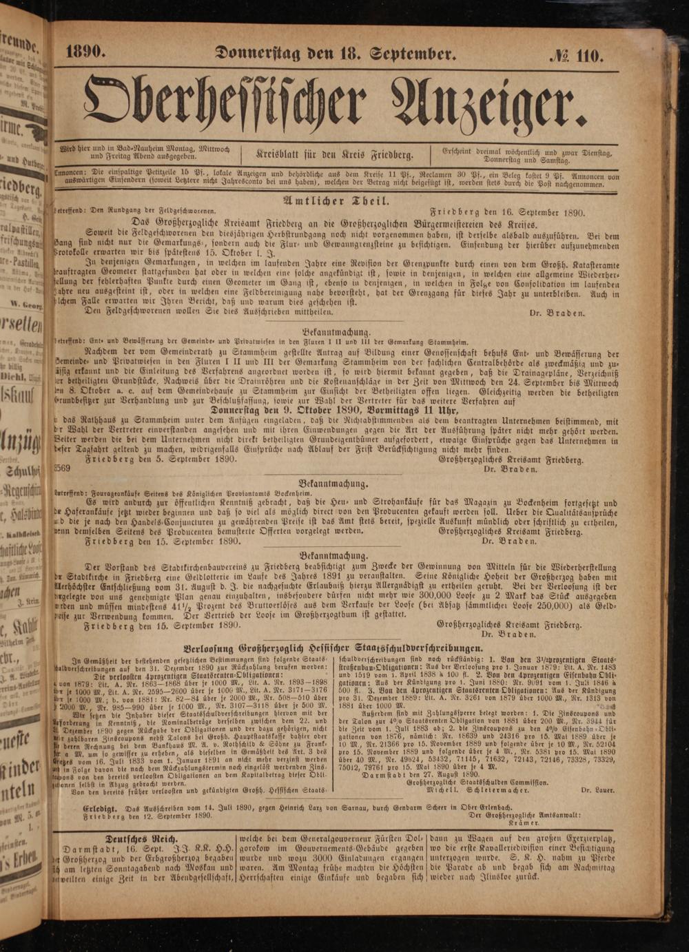 M. Friedberg den 12. September 1890. Der Oroßhegeguch. Amtsanwalt: — Krämer. 1 Deutsches Reich. welche bei dem Generalgouverneur Fürsten Dol-][dann zu Wagen auf den großen Ezerzierplatz, 1
