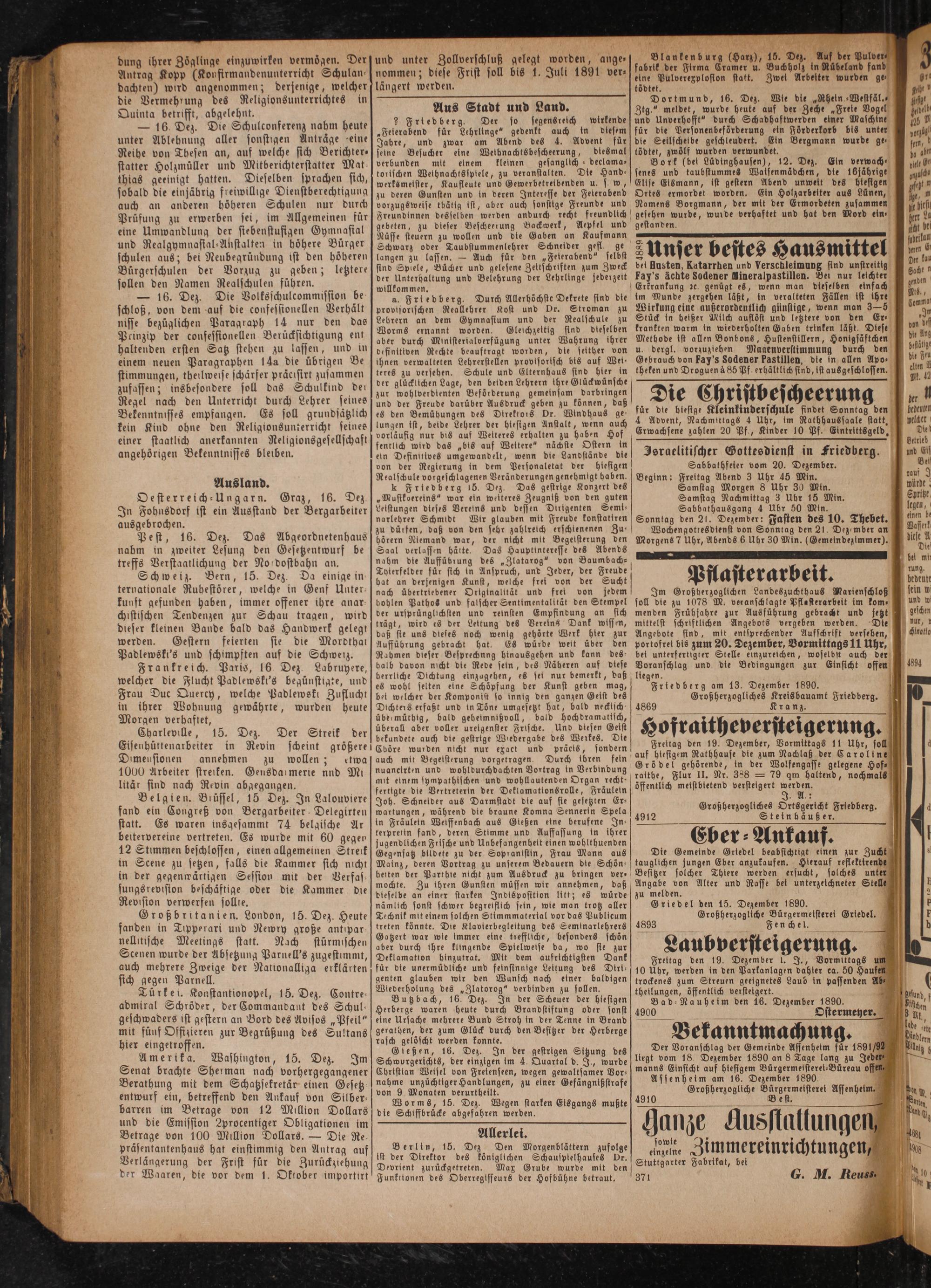 eine Pulverexploston statt. Zwei Arbelter wurden ge⸗— Ott tödtet. ght* Dortmund, 16. Dez. Wie die„Rhein.⸗Westfäl.“ g. Ztg.“ meldet, wurde heute auf der Zeche„Freie Vogel Fade und Unverhofft“ durch Schadhaftwerden einer Maschine 16 N für die Personenbeförderung ein Förderkorb bis unter voz die Seillschelbe geschleudert. Ein Bergmann wurde ge⸗— em, t tödtet, zwölf wurden verwundet. 90 abi Bork(bei Lüdinghausen), 12. Dez. Ein verwach⸗ vlt. senes und taubstummes Waisenmädchen, die 16jährige asc Elise Eismann, ist gestern Abend unwelt des hiestgen(igt Ortes ermordet worden. Ein Holzarbeiter aus Lünen, 0 n Namens Borgmann, der mit der Ermordeten zusammen 1. biet gesehen wurde, wurde verhaftet und hat den Mord ein⸗ 140 90 gestanden. be D brilal Unser bestes Hausmittel bel Husten, Katarrhen und Verschleimung sind unstreitig 75 1 Fay's ächte Sodener Hineralpastillen. Bei nur leichter 0 Erkrankung ꝛc. genügt es, wenn man dieselben einfach* im Munde zergehen läßt, in veralteten Fällen ist ihre. 111 Wirkung eine außerordentlich günstige, wenn man 325 3 Stück in heißer Milch auflöst und letztere von den Er⸗ U krankten warm in wiederholten Gaben trinken läßt. Diese 716 Methode ist allen Bonbons, Hustenstillern, Honigsäftchen] di 1 u. dergl. vorzuzlehen Magenverstimmung durch den be Gebrauch von Fay's Sodener Fastillen, die in allen Apo- 0 theken und Droguen a 85 Pf. erhältlich sind, ist ausgeschlossen.* * Die Christbescheerung für die hiesige Kleinkinderschule findet Sonntag den bebenen 4 Advent, Nachmittags 4 Uhr, im Rathhaussaale statt. J velchet Erwachsene zahlen 20 Pf., Kinder 10 Pf. Eintrittsgeld, 73 Betrie Zoraelitischer Gottesdienst in Friedberg. nd 6 ö Sabbathfeier vom 20. Dezember. Be Beginn: Freitag Abend 3 Uhr 45 Min. wf Samstag Morgen 8 Uhr 30 Min. 4 würde! Samstag Nachmittag 3 Uhr 15 Min. Syritzt Sabbathausgang 4 Uhr 50 Min. 3 Sonntag den 21. Dezember: Fasten des 10. Thebet. auen 1 Wochengottesdienst von Sonntag den 21. Dezember an Waffel Morgens 7 Uhr, Abends 6 Uhr 30 Min.(Gemeindezimmer). 45 5 PPP free Pflasterarbeit 100 * bedeute Im Großberzoglichen Landeszuchthaus Marienschloß sein w soll die zu 1078 M. veranschlagte Pflasterarbeit im kom: und w menden Frühjahre zur Ausführung gebracht und jetzt geschen mittelst schriftlichen Angebots vergeben werden. Die nur, Angebote sind, mit entsprechender Aufschrift versehen, chinatlo portofret bis zum 20. Dezember, Vormittags 11 Uhr, bei unterfertigter Stelle einzureichen, woselbst auch der Voranschlag und die Bedingungen zur Einsicht offen 4894 liegen. W am 13. Dezember 1890. 1 1 Großherzogliches Kreisbauamt Friedberg. 4869 Kranz.* Hofraitheversteigerung. Freitag den 19. Dezember, Vormittags 11 Uhr, soll d