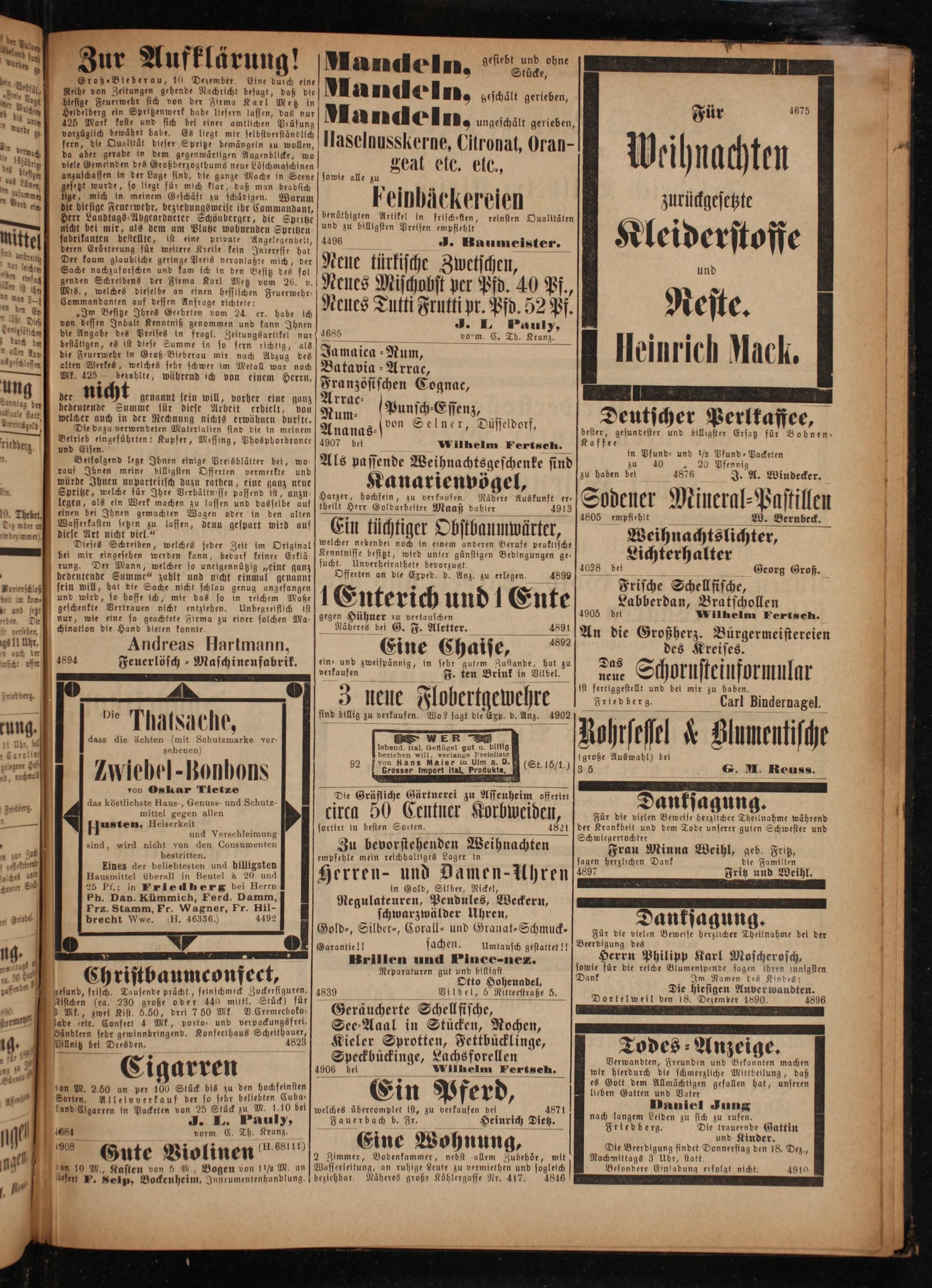 Für die vielen Beweise herzlicher Theilnahme bei der Beerdigung des 8 Herrn Philipp Karl Moscherosch, sowie für die reiche Blumenspende sagen ihren innigsten Dank Im Namen des Kindes: Die hiesigen Anver wandten. Dortelweil den 18. Dezember 1890. 4896