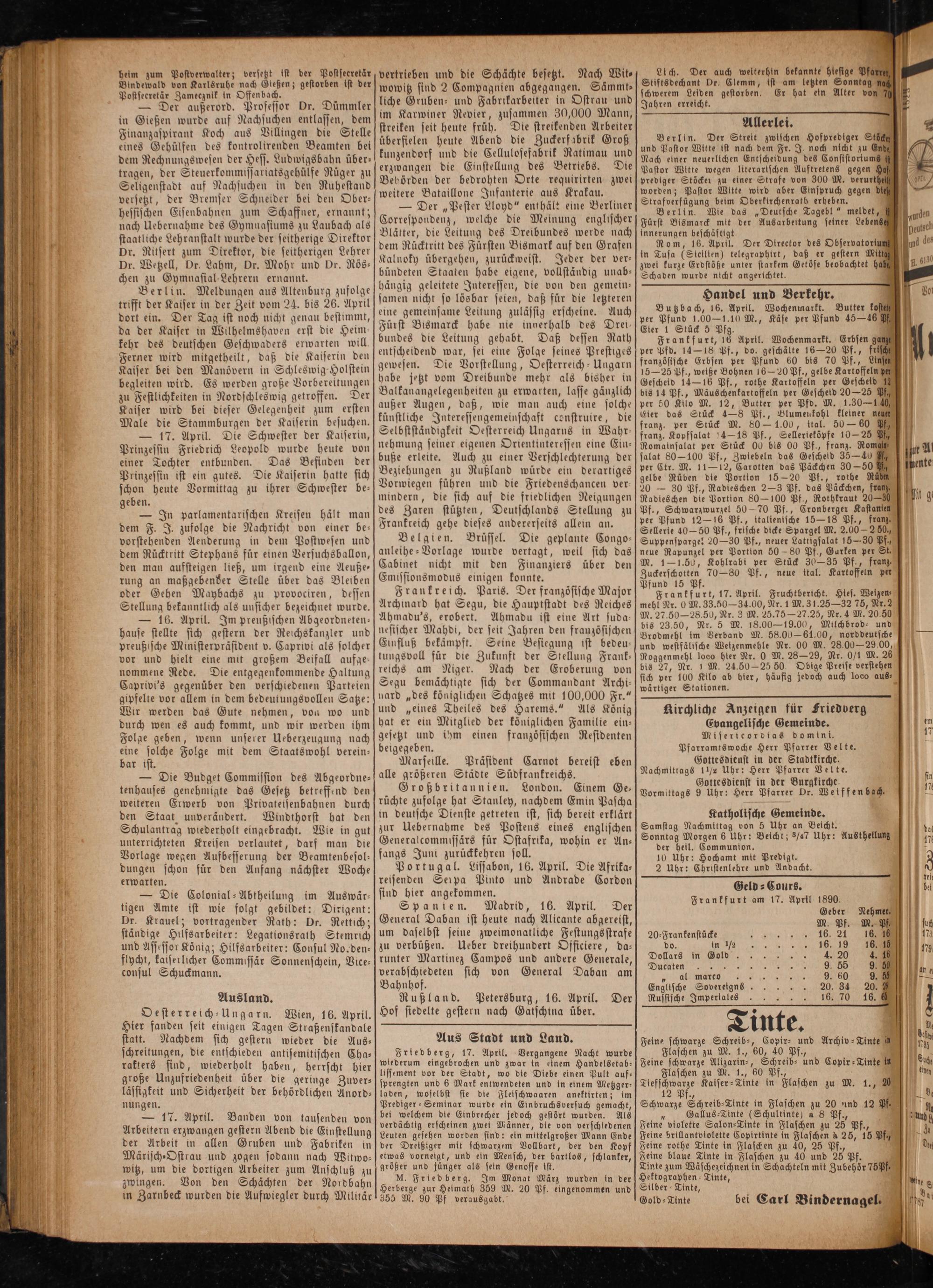M. 11.50, Kohlrabi per Stück 30-85 Pf., franz. g Zuckerschotten 7080 Pf., neue ital. Kartoffeln per Pfund 15 Pf. Frankfurt, 17. April. Fruchtbericht. Hies. Welzen“?“ mehl Nr. 0 M. 33.50-34.00, Nr. 1 M. 3 1.25—832 75, Nr. 2 M. 27.50 28.50, Nr. 3 M. 25.75- 27.25, Nr. 4 M. 20.50 5 bis 23.50, Nr. 5 M. 18.00— 19.00, Milchbrod- und Brodmehl im Verband M. 58.00 61.00, norddeutsche und westfälische Weizenmehle Nr. 00 M. 28.00— 29.00, Roggenmehl loco hier Nr. 0 M. 28— 29, Nr. 0/ M. 26 bis 27, Nr. 1 M. 24.5025 50. Obige Preise verstehen“ sich per 100 Kilo ab hier, häufig jedoch auch loco aus⸗ wärtiger Stationen. 1 Kirchliche Anzeigen für Friedberg Evangelische Gemeinde. em Miserteordtas domini. ö 1 Pfarramtswoche Herr Pfarrer Velte. Gottesdieust in der Stadtkirche. Nachmittags 1½ Uhr: Herr Pfarrer Velte. fn Gottesdienst in der Burgkirche 15 Vormittags 9 Uhr: Herr Pfarrer Dr. Weiffen bach* Katholische Gemeinde. Samstag Nachmittag von 5 Uhr an Beicht. dat Sonntag Morgen 6 Uhr: Beicht; 3/7 Uhr: Austheilung 17 der heil. Communton. 11 10 Uhr: Hochamt mit Predigt. 3 2 Uhr: Christenlehre und Andacht. f keit Geld⸗ Cours. bel Frankfurt am 17. April 1890. Geber Nehmer, M. Pf. M. Pf such 20⸗Frankenstücke 16. 21 5 do. in ½,%/h. j, 179 Dollges d, 4. 10 Wuccte nn! 9. 50] ar a „ el er,, 9. 60 9. 0— Englische Sovereigns.. 20. 34 20. Russische Imperlales. 16. 70 16. 6 6 Tinte. 10. Feine schwarze Schreib-, Copir- und Archiv-Tinte 1 90 Flaschen zu M. 1., 60, 40 Pf., 5 5