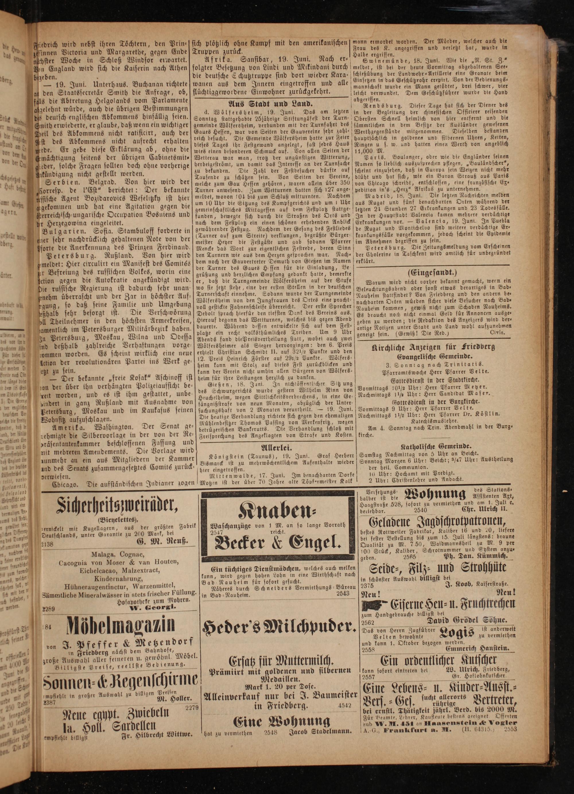 üchti 75 mannschaft wurde ein Mann getödtet, drei schwer, vier flüchtiggewordene Einwohner zurückgekehrt. 1 5 n Dem Geschützführer wurde die Hand abgerissen. 3 Aus Stadt und Land. Rendsburg. Dieser Tage hat sich der Diener des 4 d. Wölfersheim, 19. Juni. Das am letzten in der Begleitung der chinesischen Offieiere reisenden Sonntag stattgehabte 25 jährige Stiftungsfest der Turn. Obersten Schnell heimlich von bier entfernt und die gemeinde Wölfersheim, verbunden mit der Turnfahrt des sämmtlichen in dem Besitze der Ausländer gewesenen Gaues Hessen, war von Seiten der Gauvereine sehr zahl--Werthgegenstände mitgenommeg. Dtieselben Lesenden reich besucht. Die Gemeinde Wölfersheim hatte zur Feier hauptsächlich in goldenes und silbernen Uhren, Ketten dieses Tages ihr Festgewand angelegt, fast jedes Haus Ringen u s. w. und hatten einen Werth von an eblich wies einen besonderen Schmuck auf. Von allen Seiten der 11,000 M. 0 Wetterau war man, trotz der ungünstigen Witterung, Parts. Boulanger, oder wie die Engländer seinen n i h an e Namen so lieblich aus zusprechen pflegen,„Bauländscher“, Tausende zu schen fei ee N 12 5 e 1 45 85 Ae 0 1 1 S g ine, blüht und hat sich, wie ein Baron Strauß aus Paris ö„ 1 ee F 9 französische Ex⸗ 43»pedition in's„Her rika. meldet, wovon O bis zum Schluß mitturnten. Nachdem* Madrid, 18. Juni e melden um 10 Uhr die Sitzung des Kampfgerichts und um! Uhr aus Rugat und fünf benachbarten Orten während der ade d a e ee ee ee . S 1 d t 4 ci ächti nach dem Festplatz ein einen schönen erhebenden Aae— e N In Buchle 1 W 9 e des ee de Rugat und Montichelvo sind weitere verdächtige Er⸗ . 4 Nee 1 9 85 15. 1 jedoch scheint die Epidemie 0 Per Festg 1 ga ann arter im Abnehmen begriffen zu sein. Mencke das Wort zur eigentlichen Festrede, deren Sinn] Petersburg. Die Zeltungsmeldung vom Erscheinen 1 e e eee 8 1 in Taschkent wird amtlich für unbegründet r Demuth von Gießen im Namen erklärt. der Turner des Gaues H.essen für die Einladung, Be 05 und 3 Empfang gedankt hatte, ee(Eingesandt.) er, daß die Turngemeinde Woͤlfersheim auf der Stufe N i wo sie jetzt stehe, eine der ersten Stellen in der deutschen W 10. 3 e 1 Turnerschaft einnehme. Sodann wurde der T ind Beleuchtungs abend V 9 hme. S urngemeinde Nauheim stattfindet? Von Friedberg und den andern be⸗