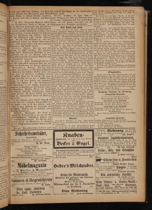Kirchliche Anzeigen für Friedberg Evangelische Gemeinde. Sonntag nach Trinitatis. Pfarramtswoche Herr Pfarrer Velte. Gottesdienst in der Stadtkirche. Vormittags 10½ Ubr: Herr Pfarrer Meyer. Nachmittags 1½ Uhr: Herr Candidat Maser.“ Gottesdienst in der Burgkirche. Vormittags 9 Uhr: Herr Pfarrer Velte. Nachmittags 1¼ Uhr: Herr Pfarrer Dr. Köstlin. Katechismuslehre. Am 4. Sonntag nach Trin. Abendmahl in der Burg⸗ kirche.