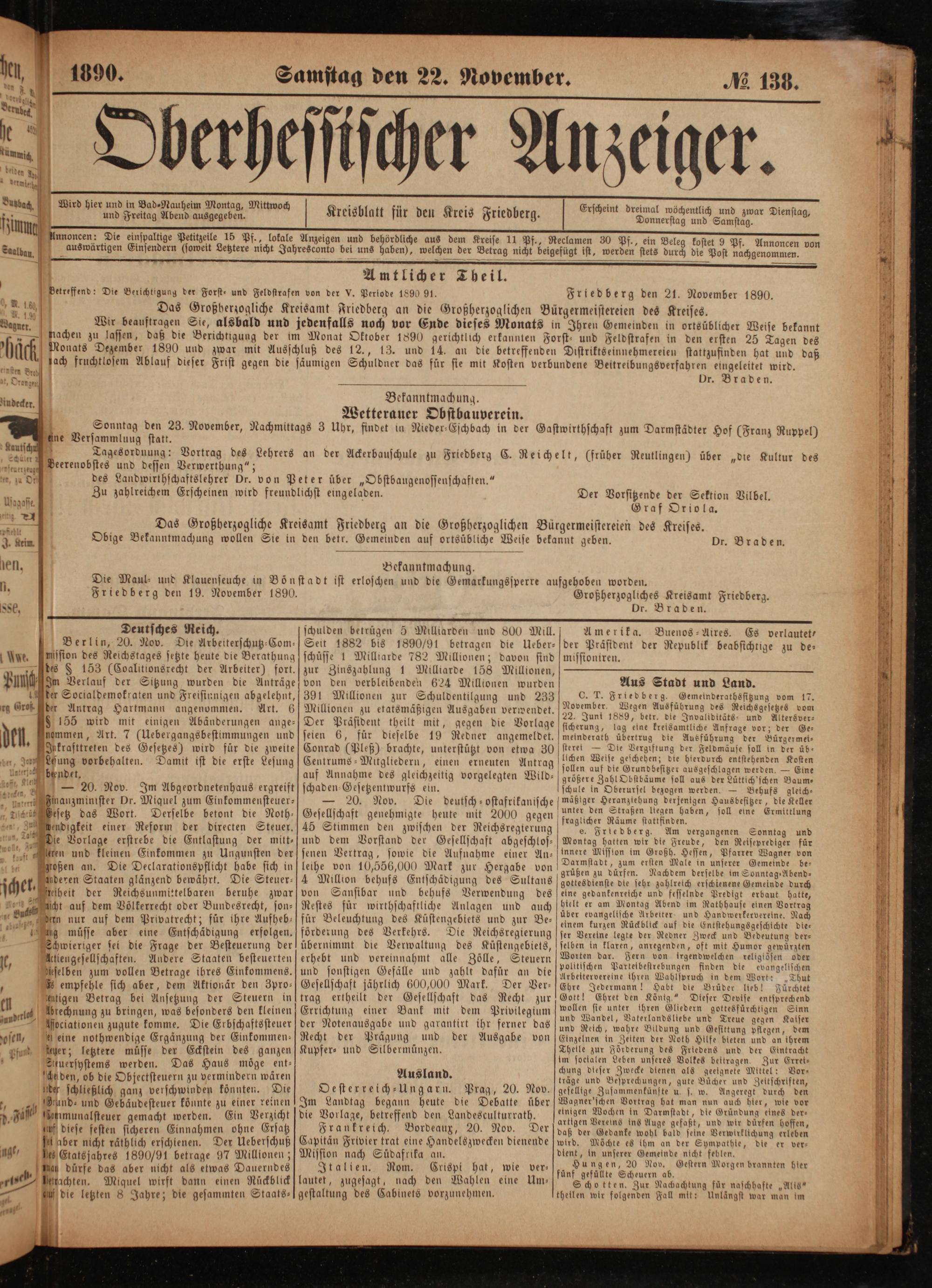 U. Friedberg den 19. November 1890. Großherzogliches Kreisamt Friedberg. SSE. Dr. Braden. Deutsches Reich. schulden betrügen 5 Milliarden und 800 Mill.) Amerika. Buenos-Aires. Es verlautet- Berlin, 20. Nov. Die Arbeiterschutz Com- Seit 1882 bis 1890/1 betragen die Ueber- der Präsident der Republik beabsichtige zu de— Me. imssion des Reichstages setzte heute die Berathungfschuͤsse 1 Milliarde 782 Millionen; davon sind missiontren. eite§ 153(Coalitionsrecht der Arbeiter) fort.] zur Zinszahlung 1 Milliarde 158 Millionen, Punt von den verbleibenden 624 Millionen wurden Aus Stadt und Land.