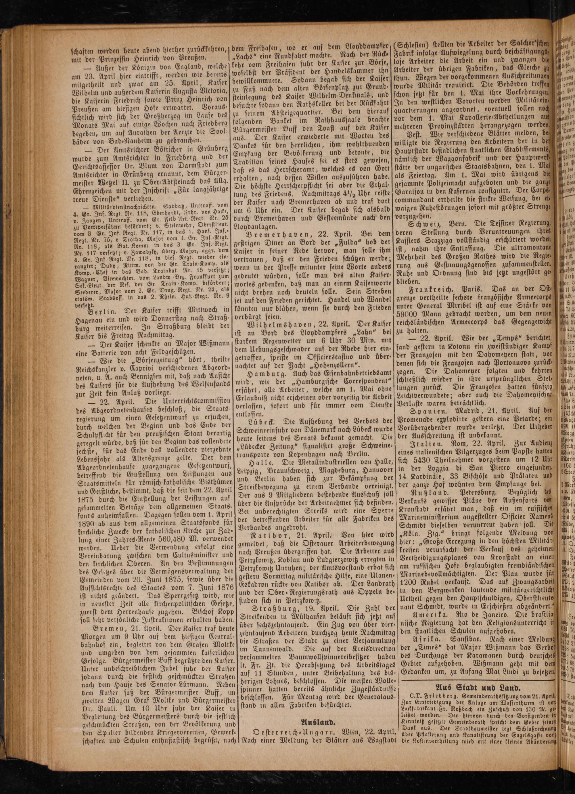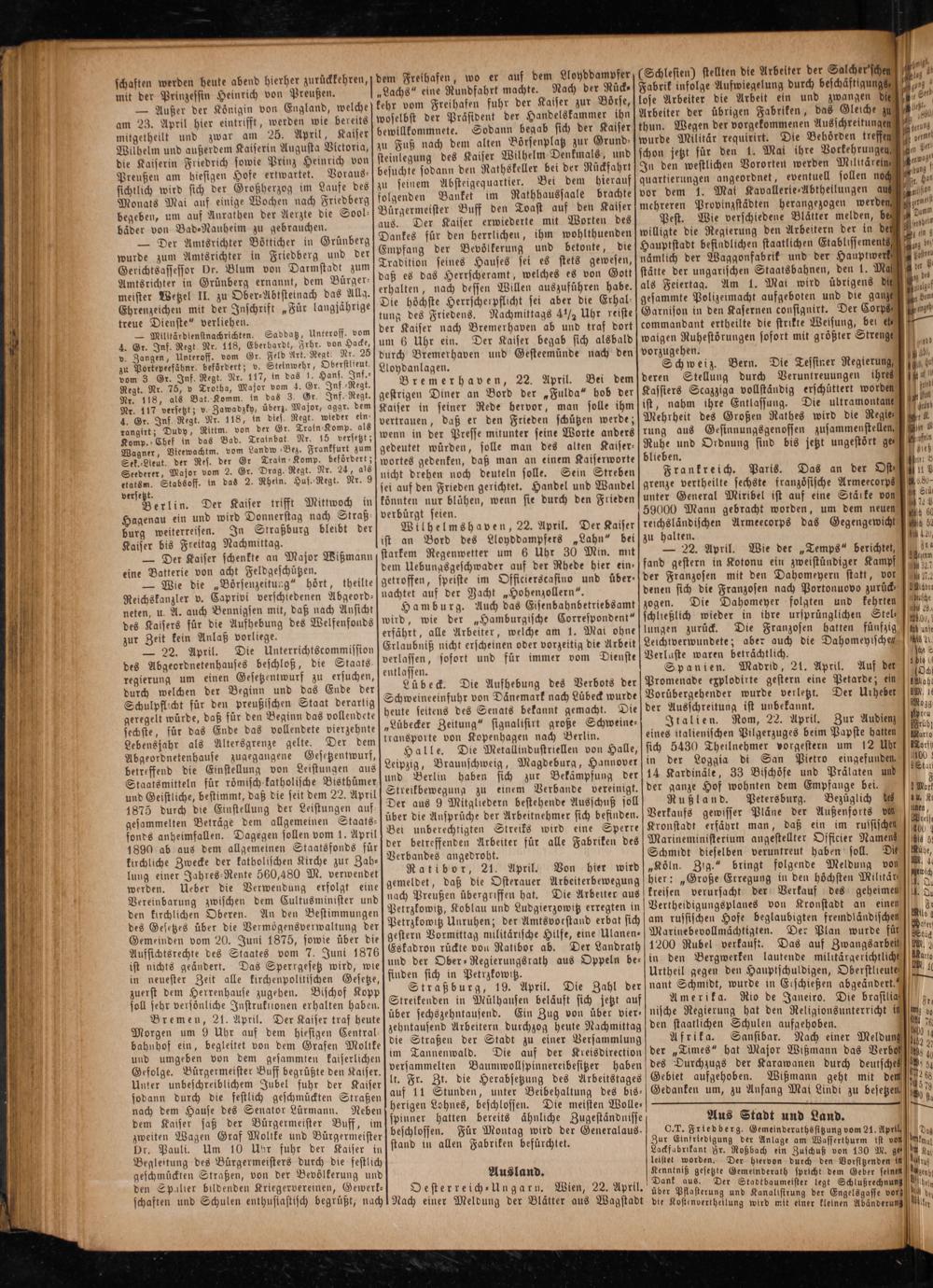 . (Schlesten) stellten die Arbeiter der Salcher'sche Fabrik infolge Aufwiegelung durch beschäftigungz lose Arbeiter die Arbeit ein und zwangen d 19 Arbeiter der übrigen Fabriken, das Gleiche zu thun. Wegen der vorgekommenen Ausschreitungen wurde Militär requirirt. Die Behörden treffen schon jetzt für den 1. Mai ihre Vorkehrunge In den westlichen Vororten werden Militärein quartierungen angeordnet, eventuell sollen noch vor dem 1. Mai Kavallerie-Abtheilungen auß mehreren Provinzstädten herangezogen werden
