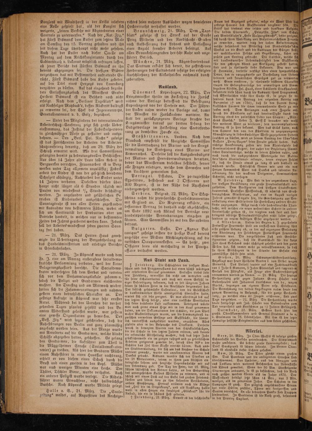 — 21. März. In Köpenick wurde nach dem Fr. J. eine am Montag einberufene socialdemo— kratische Versammlung verboten, weil der kleine Belagerungszustand herrscht. Die Socialdemo— kraten widersetzten sich dem Verbot und rotteten sich vor dem Versammlungslokale zusammen, sodaß die Polizei und Gendarmen einschreiten mußten. Am Dienstag und am Mittwoch wieder— holten sich die Zusammenrottungen und nahmen gestern einen bedrohlichen Charakter an. Der gestrige Aufruhr in Köpenick war sehr ernster Natur. Während bei den Unruhen der vorher gehenden Tagen planlos gejohlt und den Be— amten Widerstand geleistet wurde, war gestern eine gewisse Organisation zu bemerken. Der „Voss. Ztg.“ wird sogar geschrieben, daß die Ruhestörungen von Berlin aus ganz planmäßig angefacht worden seien. Aus der Menge wurde mit Revolveru auf die Gendarmen, welche blinde Schüsse abgegeben hatten, geschossen. Es gelang den Gendarmen, die Aufrührer zum Theil in die Müuggelheimer Straße(Socialdemokraten— revier) zu treiben. Als hier der Gendarm Müller einem Ruhestörer in einen Hausflur nachdrang, erhielt er von diesem einen Schuß durch die Brust und einen zweiten in den Kopf. Müller war nach wenigen Minuten eine Leiche. Der Thäter, Tischler Biene, wurde verhaftet. Auch ein anderer Polizist wurde verletzt. Die Rädels— führer waren Erwachsene, nicht halbwüchsige Bursche. Nach Köpenick wurde Militär gelegt.