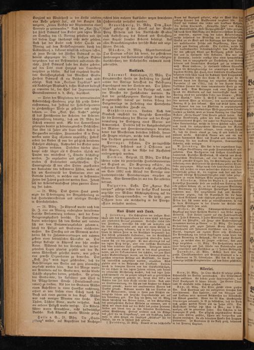 Serbien. Belgrad, 22. Marz. Die Skup—⸗ schtina nahm die provisorische Handelsconvention mit England an. Die Regierung erklärte, ein definuwer Vertrag sei deshalb nicht abgeschlossen, um Eude 1892 nach Ablauf der Verträge neue handelspoluische Vereinbarungen eingehen zu können. Eine Commission sei mit den Vorarbeiten betraut.