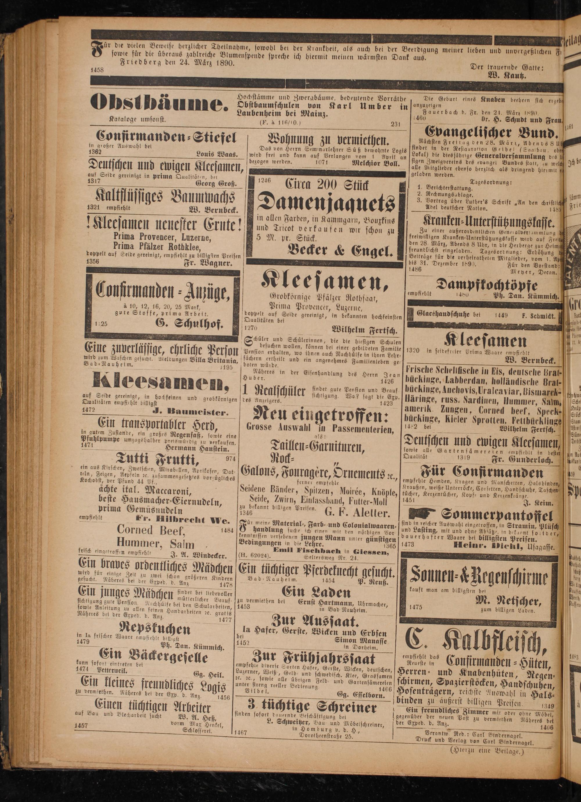 sowie für die überaus zahlreiche Blumen Friedberg den 24. März 1890.