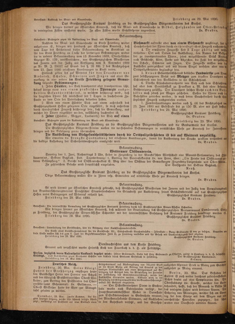 Friedberg den 29. Mai 1890. Dr. Braden. 0 Bekanntmachung. so Betreffend: Die interimistische Verwaltung des Großherzoglichen Rentamts Friedberg durch den Großherzoglichen Steuer-Assessor Schneider. be