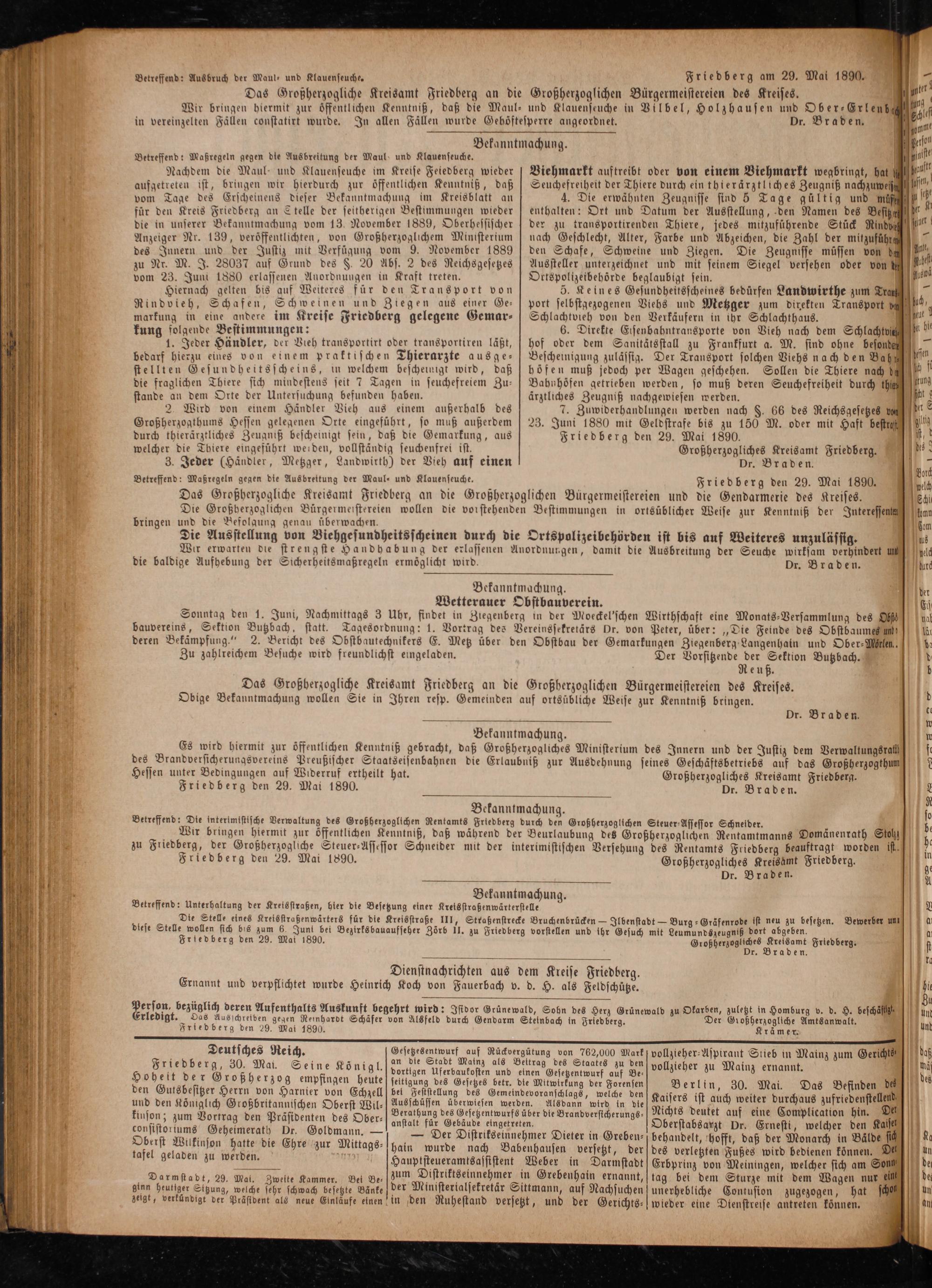 durch thierärztliches Zeugniß bescheinigt sein, daß die Gemarkung, aus Friedberg den 29. Mai 1890.* 1 welcher die Thiere eingeführt werden, vollständig seuchenfrei ist. Großherzogliches Kreisamt Friedberg. bis 3. Jeder(Händler, Metzger, Landwirth) der Vieh auf einen Dr. Braden.* Betreffend: Maßregeln gegen die Ausbreitung der Maul- und Klauenseuche. Friedberg den 29. Mai 1890. pelch Das Großherzogliche Kreisamt Friedberg an die Großherzoglichen Bürgermeistereien und die Gendarmerie des Kreises. Sch
