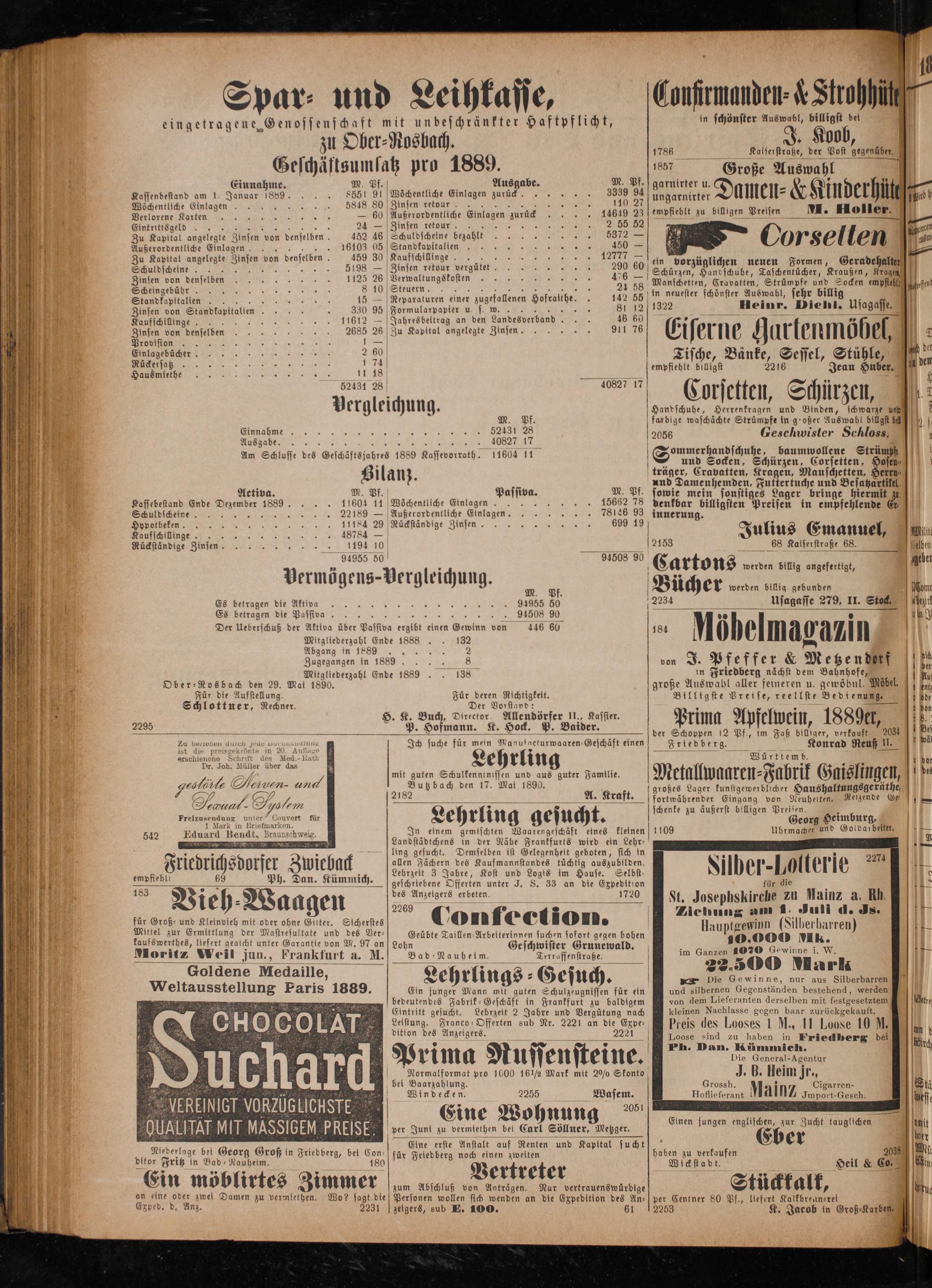 zu Ober⸗Rosbach. Geschästsumsatz pro 1889.