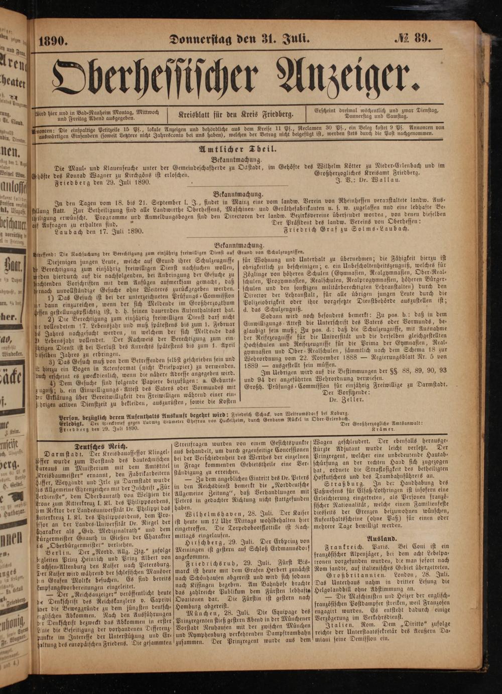 ledigt. Friedberg den 29. Juli 1890.