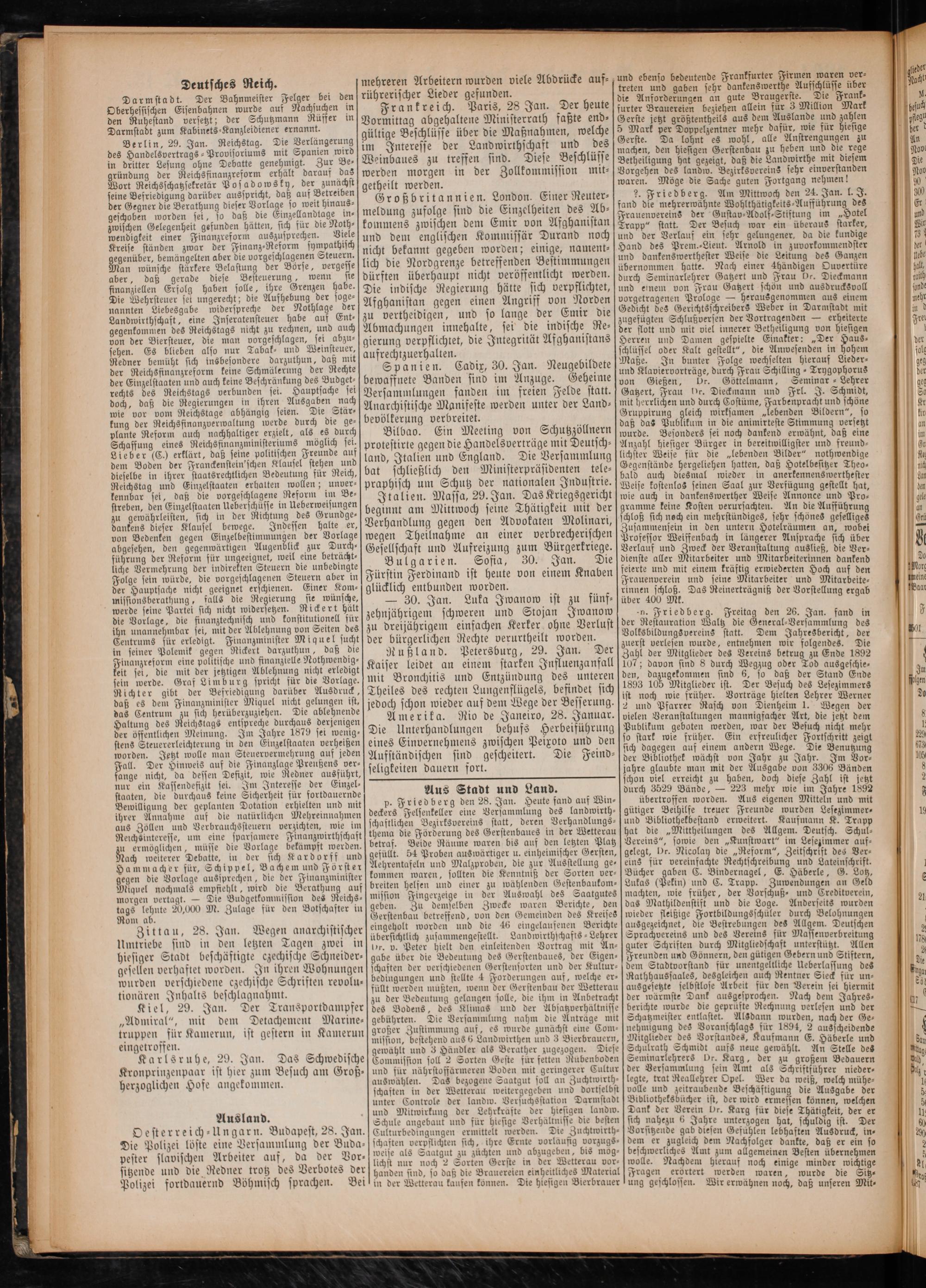 Frankreich. Paris, 28 Jan. Der heute Vormittag abgehaltene Ministerrath faßte end⸗ gültige Beschlüsse über die Maßnahmen, welche im Interesse der Landwirthschaft und des Weinbaues zu treffen sind. Diese Beschlüsse werden morgen in der Zollkommission mit—