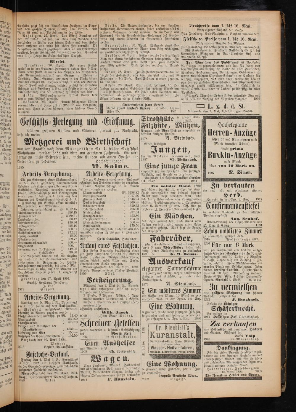 Nieder⸗Florstadt den 26. April 1894. Großh. Bürgermeisterei Nieder-Florstadt. 1958 Alles.