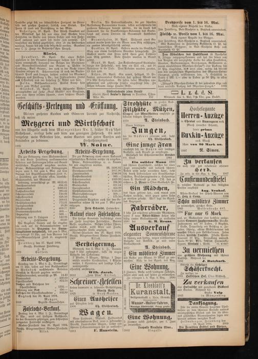 Samstag den 5. Mai d. J., Vormittags um 11 Uhr, sollen auf dem Rathhaussaal zu Wohnbach nachstehende Arbeiten öffentlich in Accord gegeben werden: Weißbinderarbeit, veranschl. zu M. 14.40 Planirarbeit 530.60 872.70