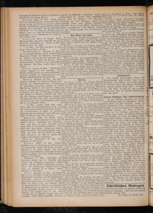 Frankfurt, 29. Aug. Heute Abend wurde im Hauptbahnhofe dem 34 Jahre alten, verheiratheten Streckenarbeiter Miltenberger aus Niederrad der rechte Arm an der Schulter abgefahren, außerdem erhielt er schwere Quetschungen an der Brust und Verletzungen am Kopfe und linken Arm.