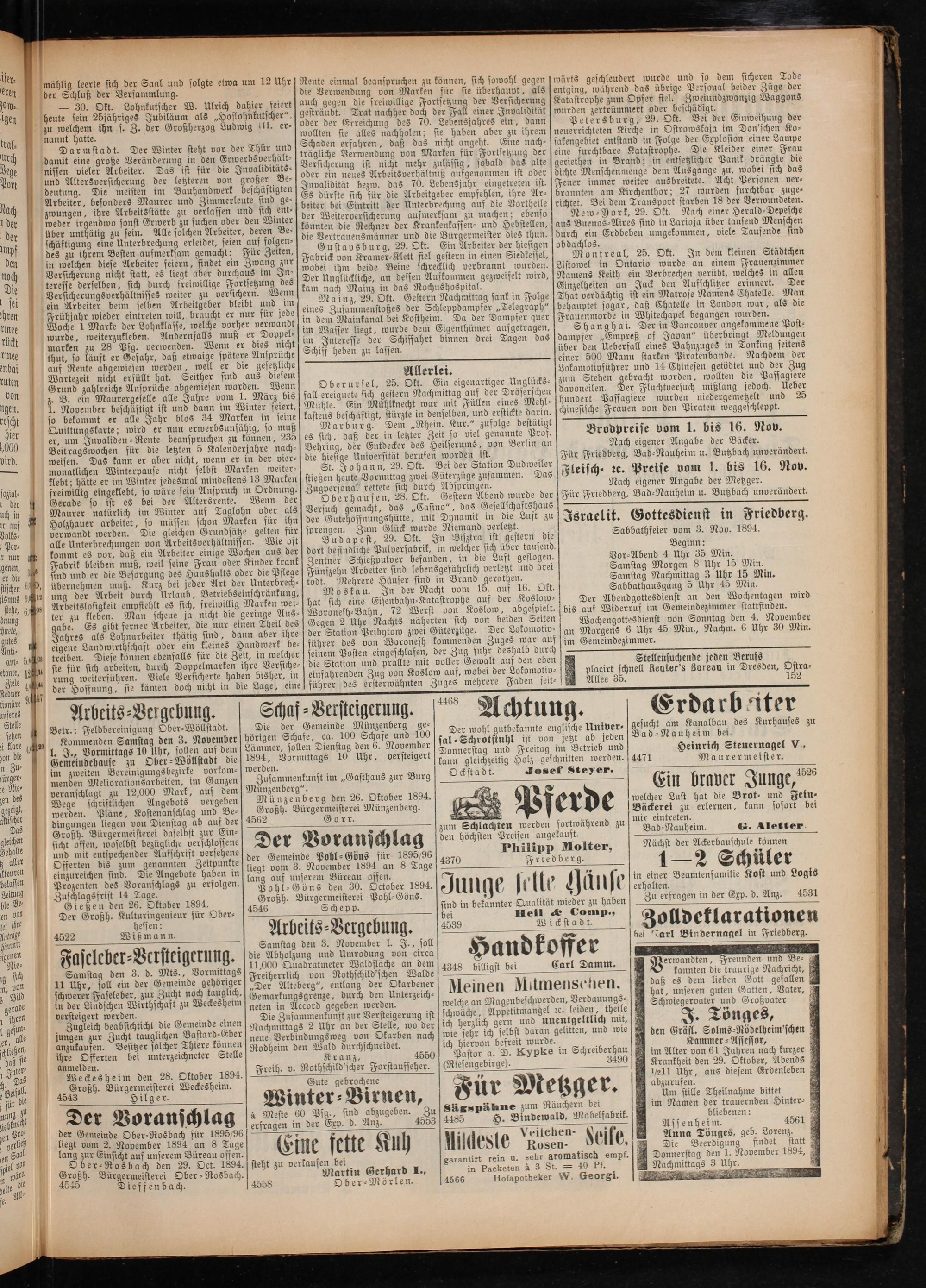 Israelit. Gottesdienst in Friedberg. Sabbathfeier vom 3. Nov. 1894. Beginn: Vor⸗Abend 4 Uhr 35 Min. Samstag Morgen 8 Uhr 15 Min.