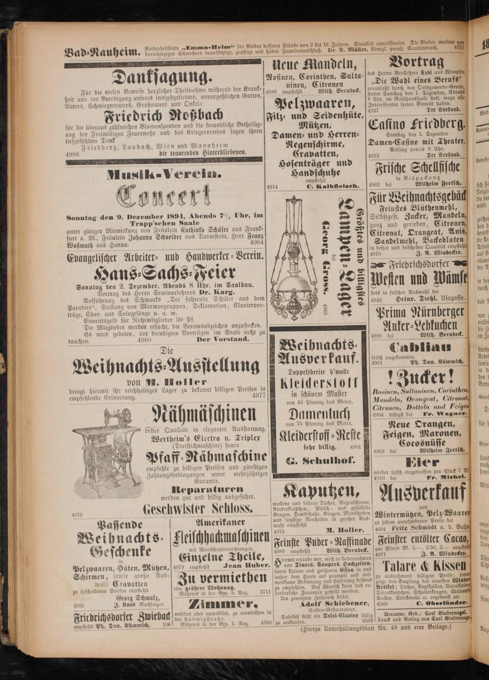 I Cravatten 4 2 a 1 Ir 1 ein* 1 8 1 ud e—. N zu be sche N* Prei 3 2 1. 8711 zu empfehl len. Auf N f—„ das er Artikel: Tucher, Kopfhüllen, Unterkle mitz 1 Georg Shah 5——— 5 S duc di 8 Tricotkleidchen, Schulterkragen, Strü 5 1926 Koob Machfolg 4* m agenet Socken, Strickwolle ꝛc. ergebenst an. 11 1 ö J. o g imm 0 Ade 1 4589 C. Oberländer. stim 113 möblirt e unmöblirt, zu vermie 3 en in Casino.Rest ux. N g 2 Fticdrichsdorfer Zwieback der In 8 wigst ze. Daselbst steht e u Tasel⸗ Clavier billig Verantw. Red.: Carl Bindernagel. 1 5 empfiehlt Ph. Dau. Kümmich. 106 Näheres b der Exp. d. Anz. 1760 zu vertan ijen. 15681! Druck und Verlag von Carl Bind 1 1(Hierzu Unterhaltungsdlatt Nr. 48 und eine Beilage.) 0 An 5 5 1 l 145 ö