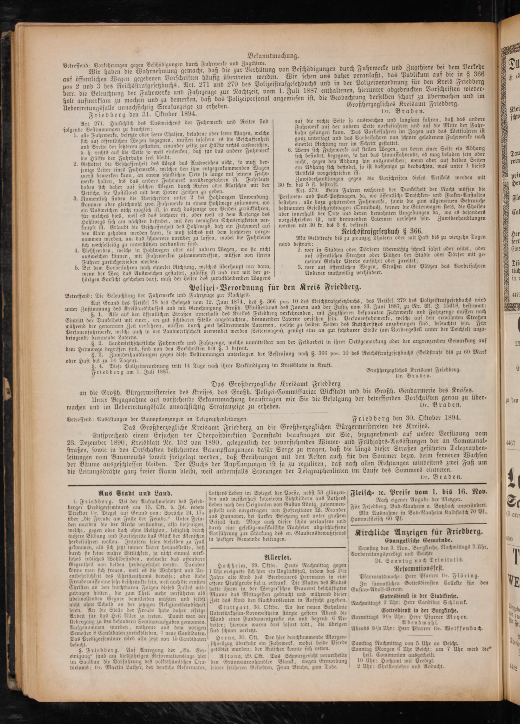 wachen und im Uebertretungsfalle unnachsichtig Strafanzeige zu erheben. Dr. Braden. Betreffend: Ausästungen der Baumpflanzungen an Telegraphenleitungen. Friedberg den 30. Oktober 1894.