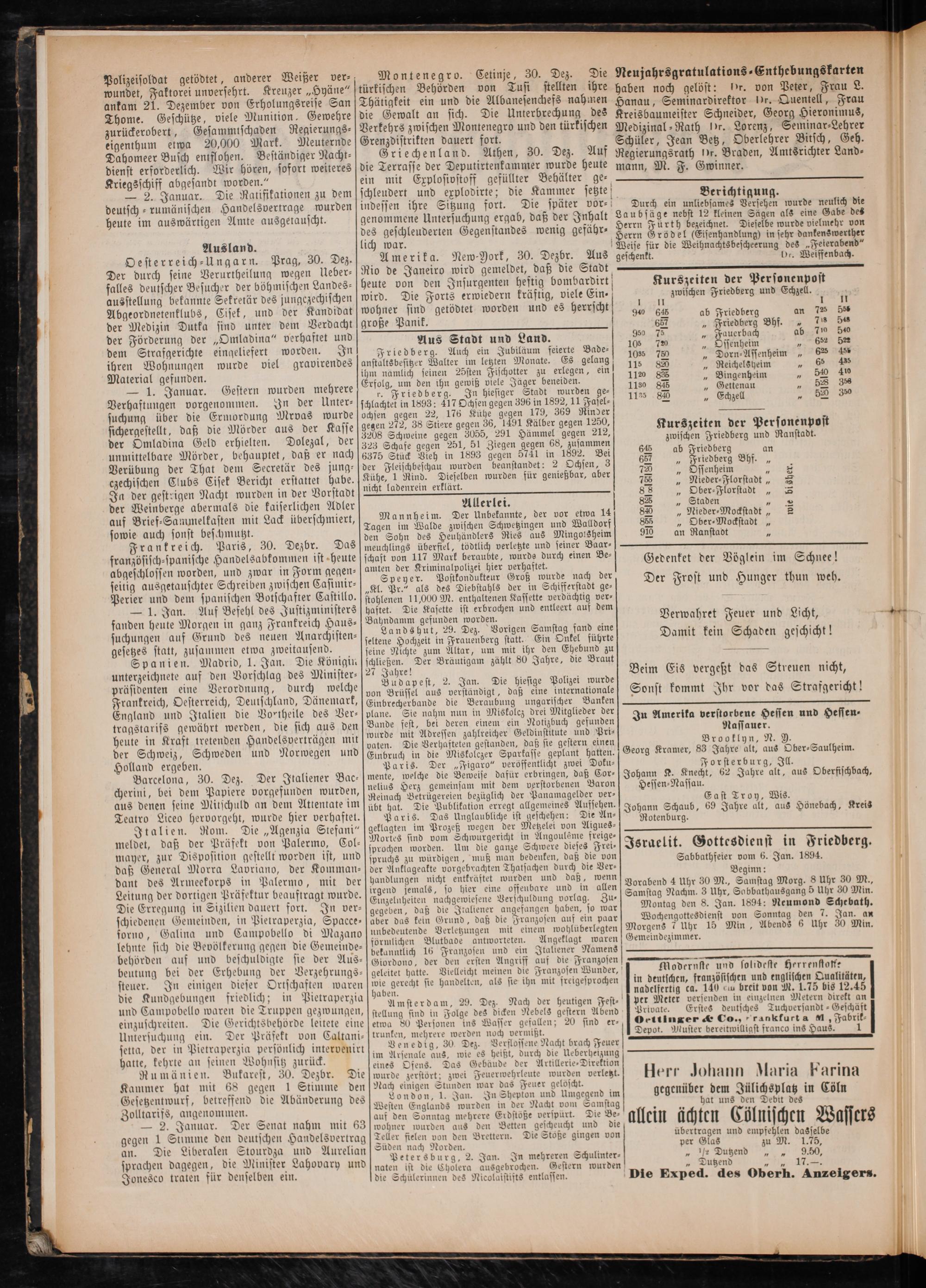 Israelit. Gottesdienst in Friedberg. Sabbathfeier vom 6. Jan. 1894. Beginn: Vorabend 4 Uhr 30 M., Samstag Morg. 8 Uhr 30 M., Samstag Nachm. 3 Uhr, Sabbathausgang 5 Uhr 30 Min. Montag den 8. Jan. 1894: Neumond Schebath. Wochengottesdienst von Sonntag den 7. Jan. an Morgens 7 Uhr 15 Min, Abends 6 Uhr 30 Min. Gemeindezimmer.