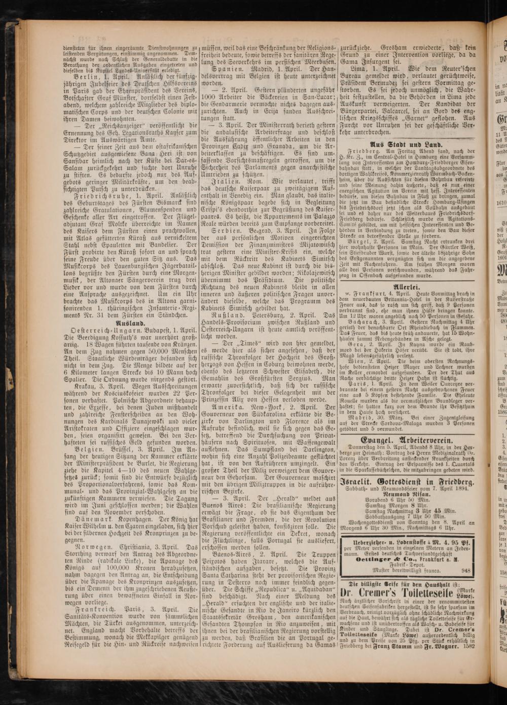 — 3. April. Der Ministerrath berieth gestern die andalusische Arbeiterfrage und beschloß die Ausführung öffentlicher Arbeiten in den Provinzen Cadix und Granada, um die Ar⸗ beiterklassen zu beschäftigen. Es sind um— fassende Vorsichtsmaßregeln getroffen, um die Sicherheit des Parlaments gegen anarchistische Umtrieben zu schützen.