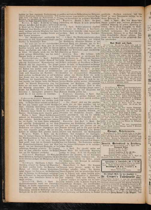 Vorabend 6 Uhr 50 Min. Samstag Morgen 8 Uhr. Samstag Nachmittag 3 Uhr 45 Min. Sabbathausgang 7 Uhr 50 Min. Wochengottesdienst von Sonntag den 8. April an Morgens 6 Uhr 30 Min., Nachmittags 6 Uhr.