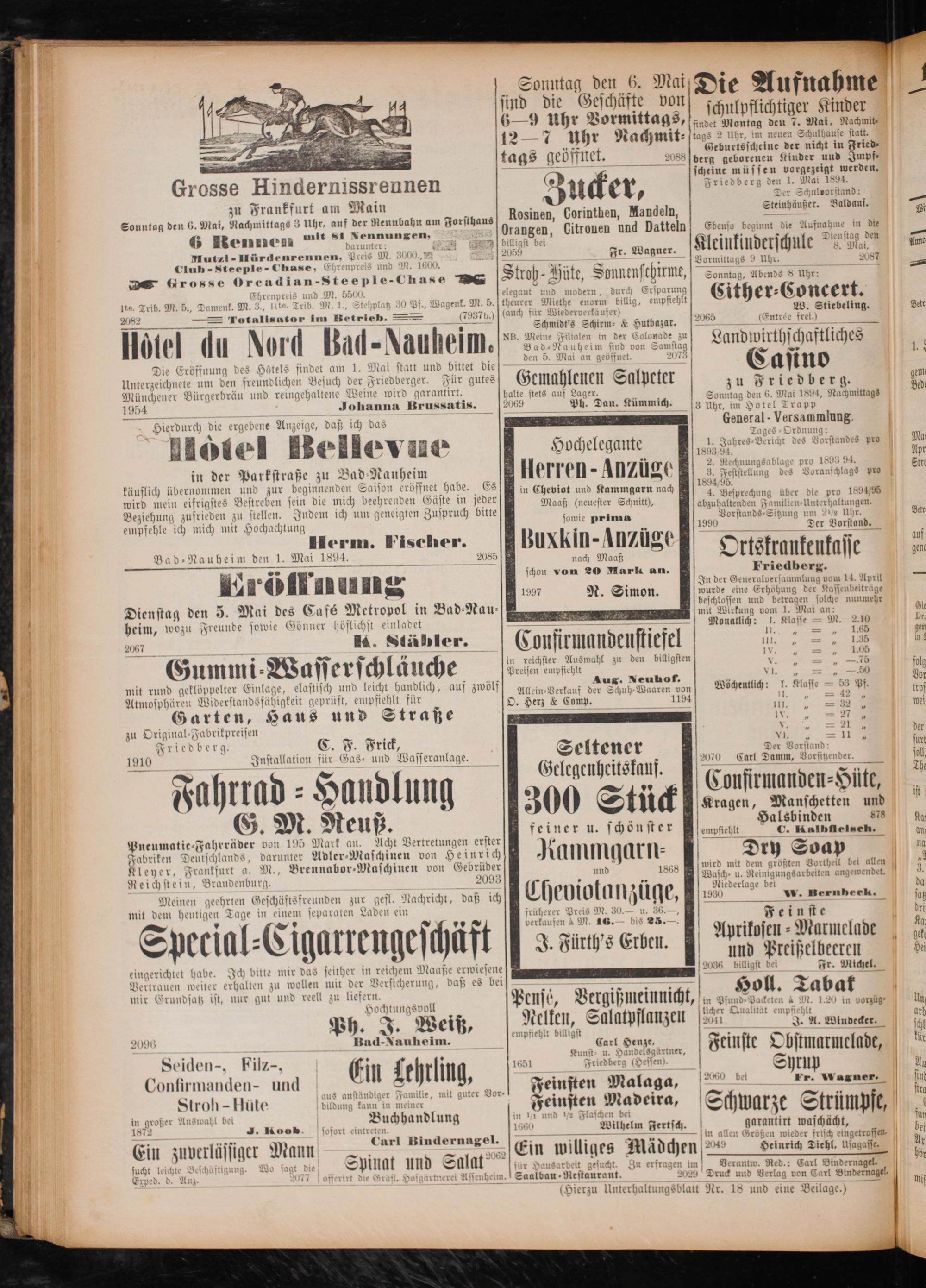 nach Maaß schon von 20 Mark an. Friedberg. f In der Generalversammlung vom 14. April 1997 N. Simon. wurde eine Erhöhung der Kassenbeiträge beschlossen und betragen solche nunmehr * n mit Wirkung vom 1. Mai an: 2 Monatlich: J. Klasse M. 2.10 1*— 1 1.65 Conftrmandenft iefel 1. 2 7 15 0— 02 in reichster Auswahl zu den billigsten* 2 1 75 Preisen empfiehlt C1 Aux. Neuhof. 2 5 1 Allein-Verkauf der Schuh⸗Waaren von Wöchentlich: 8 dlasse 8* Pf. O. Herz& Comp. 1194 97 2 ——.— 5 25 9 2 W. VJ.„ 2 21 N 7 2