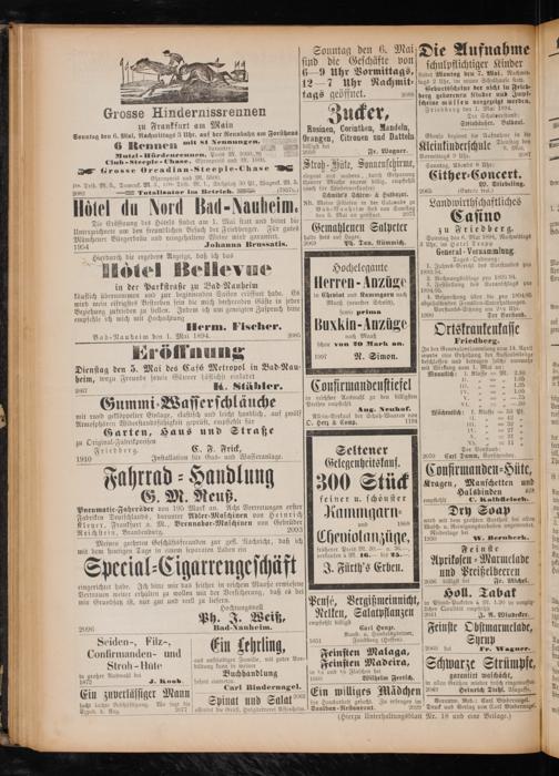 theurer Miethe enorm billi (auch für Wiederverkäufer) Schmidt's Schirm⸗& Hutbazar. NB. Meine Filialen in der Colonade zu Bad⸗Nauheim sind von Samstag den 5. Mai an geöffnet. 2073