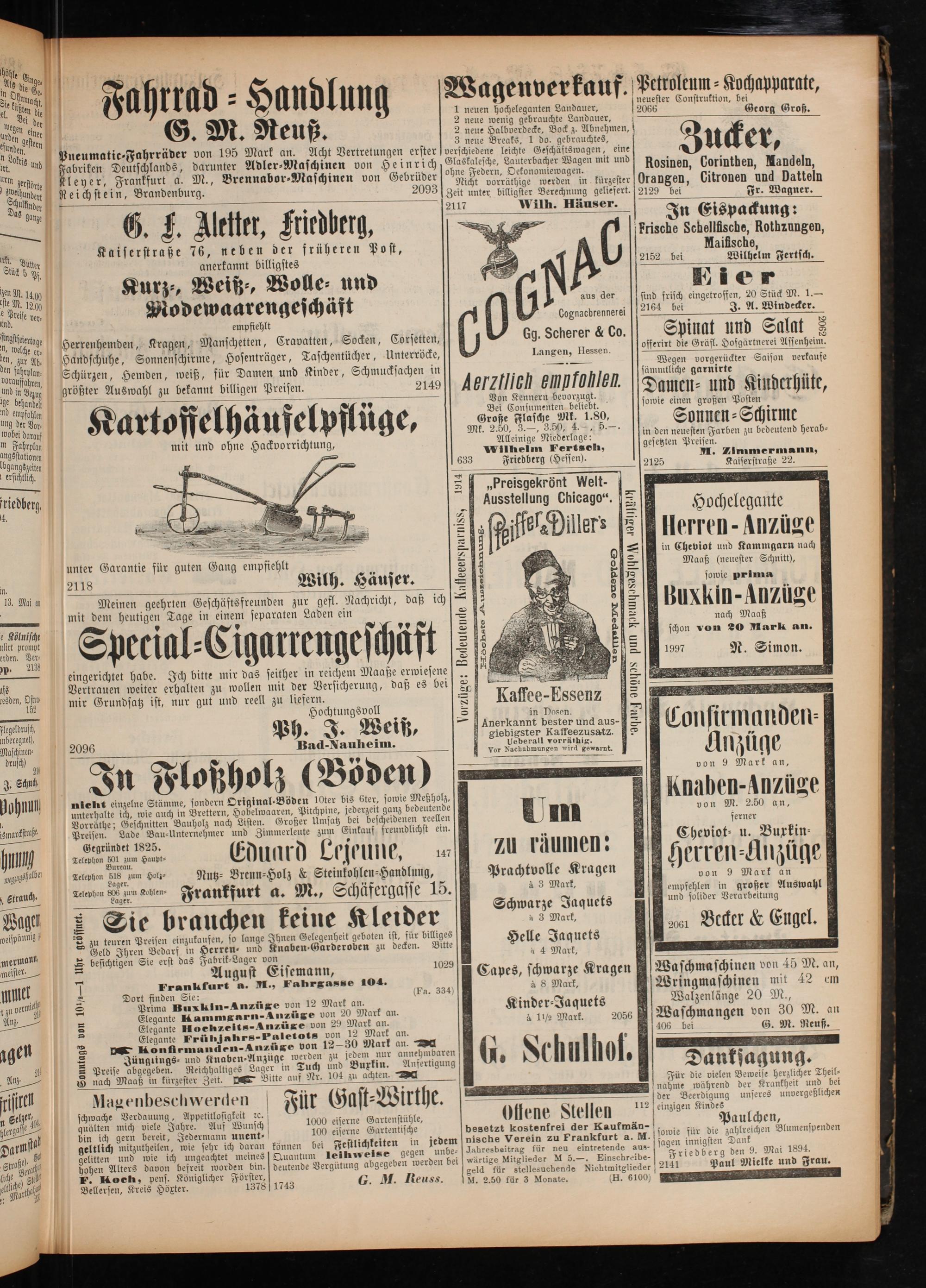 aide hun Greßz Fiasch Ja 1.89, Sonnen⸗Schirme rauf Mk. 2.50, 3.—, 3.50, 4., 5.—. g m Fahrplan 1 8; Alleinige Niederlage: in den neuesten Farben zu bedeutend herab⸗ bannen mit und ohne Hackvorrichtung, Wilneim Fertseh, gesenten Pen E n 532 Fri Hessen). 5 1 5 h FF— 1 0» preisgekrönt Welt- e 5 edberg, Ausstellung Chicago“. 1 8 5 5 5 Chicago“. S. Hochelegante 2 2 5 D. ö 2 0 710 2 i 2Dillers s Herren-Anzüge ö——— 8 2 0 in Cheviot und Kammgarn nach unter Garantie für guten Gang empfiehlt— 5 8 94= Maaß(meuester Schnitt), ** 8 2—— n. 2118 Wilh. Häuser.— 5 N 2 sowie prima g 5 5 i——— 2 N 1 13. Mui n 15 Meinen geehrten Geschäftsfreunden zur gefl. Nachricht, daß ich“ 3 5— Buxkin-Anzüge mit dem heutigen Tage in einem separaten Laden ein 2 4 818 e ae 0 9 5% 5 12 918 nach Maaß Kölnischt 8 4 5.1 schon von 20 Mark an. 17 15 2 ng. 2 5 2 1 erden. Ver⸗——— 9: p. 2138 5 ö f i g N b 7 93— 10 2 1997 N. Simon. eingerichtet habe. Ich bitte mir das seither in reichem Maaße erwiesene.. 5 5. 2 . 5 Vertrauen weiter erhalten zu wollen mit der Versicherung, daß es bei] 2 1 855— 8 e mir Grundsatz ist, nur gut und reell zu liefern. 2 Kaffee-ESSenz 8 r — Hochtungsvoll S nden 2 1 0 flegeldrusc, N Anerkannt bester und aus-— 0 f.. 0* beregneh, 2096 Ph. 17 Weiß, eiepigster, Kaltes ats 8 On 1 mat en Maschnen⸗ 4 9 n—— Vor Wuchehmangen vnd earn Anzüge