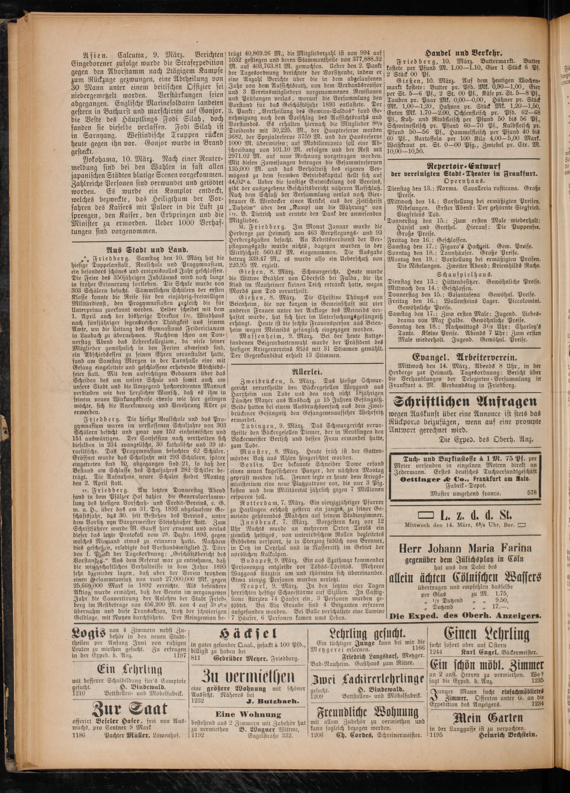feier statt. Mit dem aufrichtigen Bedauern über das Scheiden des um unsere Schule und somit auch um unsere Stadt und die Umgegend hochverdienten Mannes verbinden wir den herzlichen Wunsch, daß es ihm in seinem neuen Wirkungskreise ebenso wie hier gelingen möchte, sich die Anerkennung und Verehrung Aller zu erwerben. Friedberg. Die hiesige Realschule und das Pro— a waren im verflossenen Schuljahre von 303 chülern besucht und zwar von 152 einheimischen und 151 auswärtigen. Der Confession nach vertheilten sich dieselben in 234 evangelische, 30 katholische und 39 is⸗ raelitische. Das Progymnasium besuchten 62 Schüler. Eröffnet wurde das Schuljahr mit 293 Schülern, später eingetreten sind 10, abgegangen sind 21, so daß der Bestand am Schlusse des Schuljahres 282 Schüler be— trägt. Die Aufnahme neuer Schüler findet Montag den 2. April statt. rr. Friedberg. Am letzten Donnerstag Abend fand in dem Pfälzer Hof dahier die Generalversamm— lung des hiesigen Vorschuß- und Credit-Bereins, e. G. m. u. H., über das am 31. Dez. 1893 abgelaufene Ge— schäftsjahr, das 30. seit Bestehen des Vereins, unter dem Vorsitz von Bürgermeister Steinhäußer statt. Zum Schriftführer wurde M. Gauff hier ernannt und verlas dieser das letzte Protokoll vom 28. Dezbr. 1893, gegen welches Niemand etwas zu erinnern hatte. Nachdem dies geschehen, erledigte das Vorstandsmitglied J. Dörr den 1. Punkt der Tagesordnung:„Geschäftsbericht des Vorstandes.“ Aus dem Referat war zu entnehmen, daß die withschaftlichen Verhältnisse in dem Jahre sehr darnieder lagen, daß aber der Verein trotzdem einen Gesammtumsatz von rund 27,000,000 Mk. gegen 25,660,000 Mark in 1892 erreichte. Als besondere