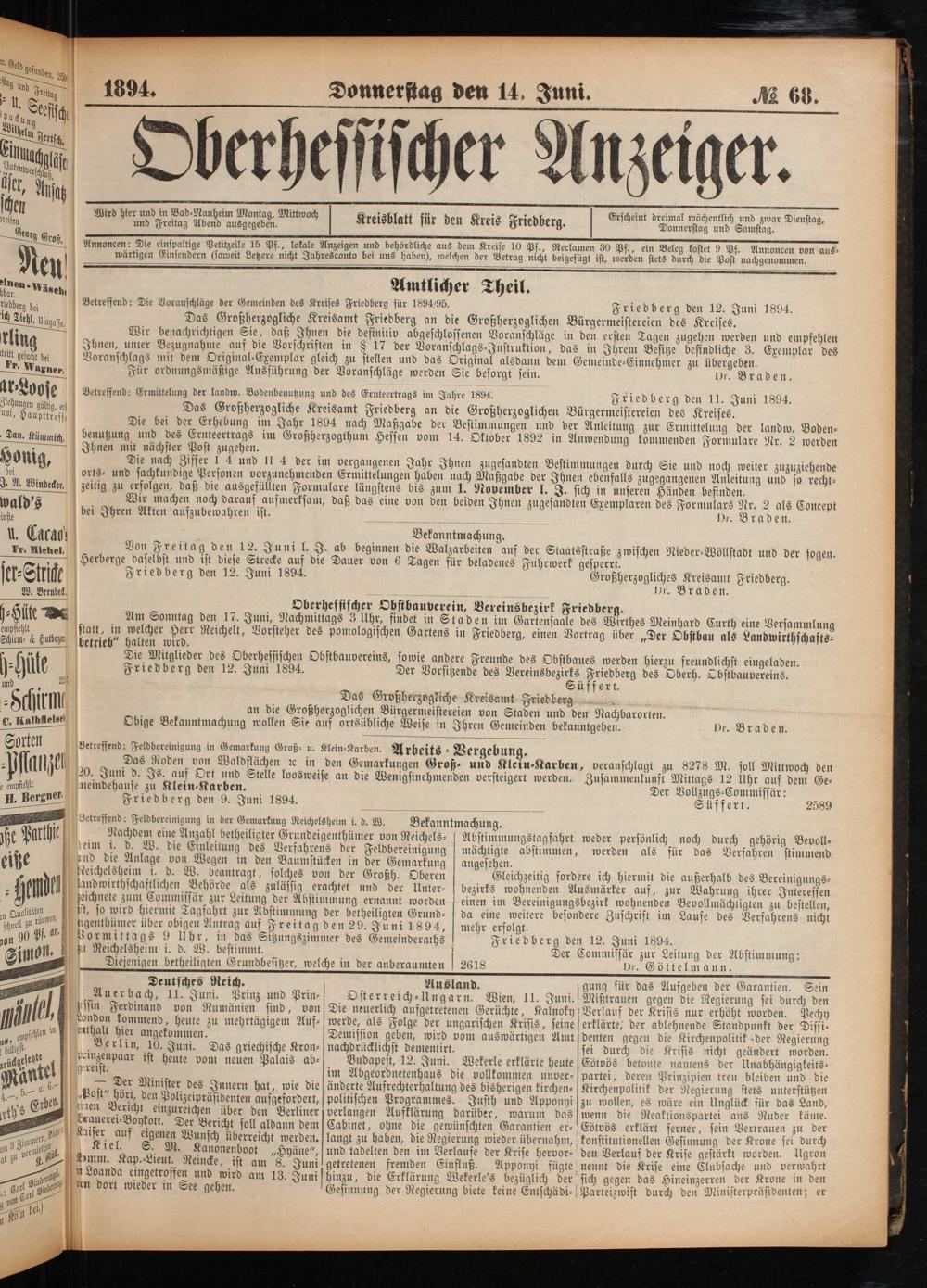 Friedberg den 12. Juni 1894. Großherzogliches Kreisamt Friedberg.