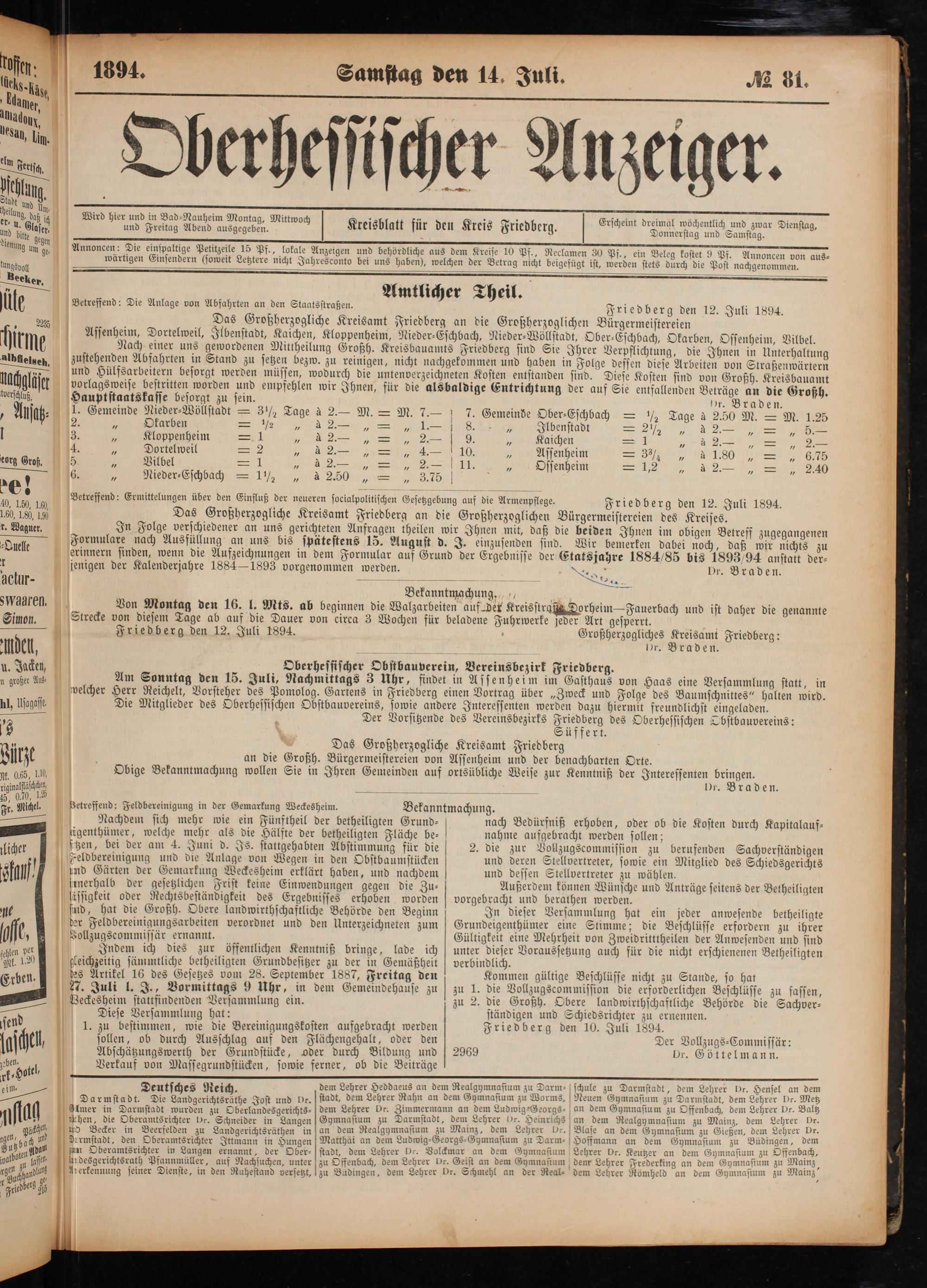 derscluß Hauptstaatskasse besorgt zu sein. 5 f Ur. Braden. Ausatz⸗ 1. Gemeinde Nieder-Wöllstadt S 3½ Tage à 2.— M. S M. 7.— 7. Gemeinde Ober-Eschbach S J Tage à 2.50 M. S M. 1.25 3 1. f— 11 5.— 8 5 n Auen— 155„ 22 5 3. 55 loppenheim— M e 5 55 Kaichen—% ee e ,, 4. 1 Dortelweil 2 e e 10 0 Assenheim= n,, eorg Groß. 5 1 Vilbel— 1%. 5 Ossenheim= 1%„ a. 2.„„ K 6. 5 Nieder⸗Eschbach= 1½„ 2 2.50„=„ 3.75 5 90 Betreffend: Ermittelungen über den Einfluß der neueren socialpolitischen Gesetzgebung auf die Armenpflege. Friedberg den 12. Juli 1894. 1 0 10 Das Großherzogliche Kreisamt Friedberg an die Großherzoglichen Bürgermeistereien des Kreises. r. Wagner. In Folge verschiedener an uns gerichteten Anfragen theilen wir Ihnen mit, daß die beiden Ihnen im obigen Betreff zugegangenen 8 Formulare nach Ausfüllung an uns bis spätestens 15. August d. J. einzusenden sind. Wir bemerken dabei noch, daß wir nichts zu Quell erinnern sinden, wenn die Aufzeichnungen in dem Formular auf Grund der Ergebnisse der Etatsjahre 1884/85 bis 1893/94 anstatt der⸗ r jenigen der Kalenderjahre 1884— 1893 vorgenommen werden. 8 Dr. Braden. 5 eee 118 SWaaren. Von Montag den 16. l. Mts. ab beginnen die Walzarbeiten auf. der Kreisstrastz Jorheim—Fauerbach und ist daher die genannte Simon. Strecke von diesem Tage ab auf die Dauer von eirca 3 Wochen für beladene Fuhrwerke jeder Art gesperrt.. 5 Friedberg den 12. Juli 1894. 0 Großherzogliches Kreisamt Friedberg: den 5 r. Braden. 1 5 5 1 5 u. Jacken, Oberhessischer Obstbauverein, Vereinsbezirk Friedberg. 5 gehe Aus- Am Sonntag den 15. Juli, Nachmittags 3 Uhr, findet in Assenheim im Gasthaus von Haas eine Versammlung statt, in velcher Herr Reichelt, Vorsteher des Pomolog. Gartens in Friedberg einen Vortrag über„Zweck und Folge des Baumschnittes“ halten wird. hl, Usagasse Die Mitglieder des Oberhessischen Obstbauvereins, sowie andere Interessenten werden dazu hiermit freundlichst eingeladen. 75 Der Vorsitzende des Vereinsbezirks Friedberg des Oberhessischen Obstbauvereins: b N f. Süffert. 1 Das Großherzogliche Kreisamt Friedberg Vürze an die Großh. Bürgermeistereien von Assenheim und der benachbarten Orte. b 65, 10 Obige Bekanntmachung wollen Sie in Ihren Gemeinden auf ortsübliche Weise zur Kenntniß der Interessenten bringen. Aae Dr. Braden. 5 0.0, 1 3 15 N gr. Michel. Betreffend: Feldbereinigung in der Gemarkung Weckesheim. Bekanntmachung. N 5 . Nachdem sich mehr wie ein Fünftheil der betheiligten Grund— nach Bedürfniß erhoben, oder ob die Kosten durch Kapitalauf⸗ 32 genthümer, welche mehr als die Hälfte der betheiligten Fläche be⸗ nahme aufgebracht werden sollen; 1 licher stzen, bei der am 4. Juni d. Is. stattgehabten Abstimmung für die 2. die zur Vollzugscommission zu berufenden Sachverständigen il Feldbereinigung und die Anlage von Wegen in den Obstbaumstücken und deren Stellvertreter, sowie ein Mitglied des Schiedsgerichts 1 ind Gärten der Gemarkung Weckesheim erklärt haben, und nachdem und dessen Stellvertreter zu wählen. f 8 J inerhalb der gesetzlichen Frist keine Einwendungen gegen die Zu— Außerdem können Wünsche und Anträge seitens der Betheiligten lissigkeit oder Rechtsbeständigkeit des Ergebnisses erhoben worden vorgebracht und berathen werden.. 12 e ind, hat die Großh. Obere landwirthschaftliche Behörde den Beginn In dieser Versammlung hat ein jeder anwesende betheiligte f der Feldbereinigungsarbeiten verordnet und den Unterzeichneten zum[Grundeigenthümer eine Stimme; die Beschlüsse erfordern zu ihrer e, Vollzugscommissär ernannt. 5 5. be ich Gültigkeit 455 Mehrheit von 1 e 10 7 sind 16 5 r Indem ich dies zur öffentlichen Kenntniß bringe, la e ich unter dieser Voraussetzung auch für die nicht erschienenen Betheiligten 1. 420 leichzeitig sämmtliche betheiligten Grundbesitzer zu der in Gemäßheit verbindlich. Mk. eichzeitig 5 b 5 o n 555 5 ben.]! des Artikel 16 des Gesetzes vom 28. September 1887, Freitag den Kommen gültige Beschlüsse nicht zu Stande, so hat 1 Er 27. Juli l. J., Vormittags 9 Uhr, in dem Gemeindehause zu zu 1. die Vollzugscommission die erforderlichen Beschlüsse zu fassen, Veckesheim stattfindenden Versammlung ein. zu 2. die Großh. Obere landwirthschaftliche Behörde die Sachver⸗ e Diese Versammlung hat:.. ständigen und Schiedsrichter zu ernennen. send 1. zu bestimmen, wie die Bereinigungskosten aufgebracht werden Friedberg den 10. Juli 1894.. 155 ö sollen, ob durch Ausschlag auf den Flächengehalt, oder den Der Vollzugs-Commissär: U ll, 1 schä 8 stii N 9980 Gi Abschätzungswerth der Grundstücke, oder durch Bildung und 2969 Dr. Göttelmann. . hut Verkauf von Massegrundstücken, sowie ferner, ob die Beiträge ö rk⸗ i 0 rei L Heddaeus dem Realgymnasium zu Darm- schule zu Darmstadt, dem Lehrer Dr. Hensel an dem n g Darmstadt e Jost und Or. n dem tüm zu Worms, Neuen Gymnasium zu Darmstadt, dem Lehrer Dr. Metz