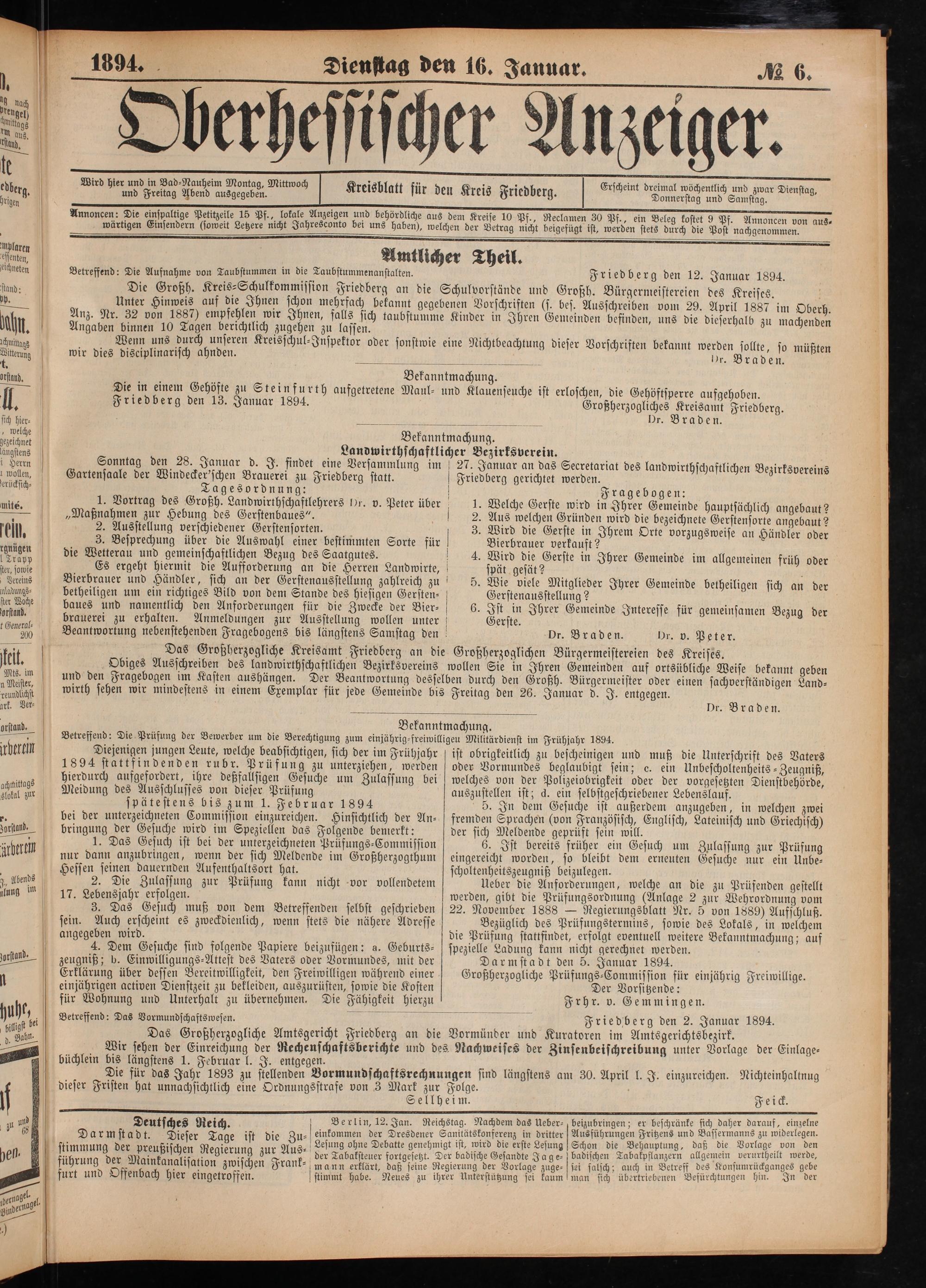 Gerste. Dr. Braden. Dr. v. Peter. Großherzoglichen Bürgermeistereien des Kreises. len Sie in Ihren Gemeinden auf ortsübliche Weise bekannt geben