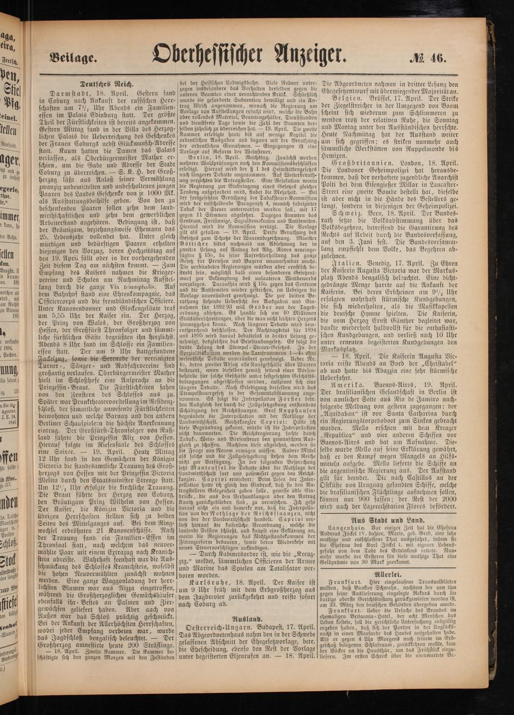 Darmstadt, 18. April. Gestern fand in Coburg nach Ankunft der russischen Herr— schaften um 7¼ Uhr Abends ein Familien— essen im Palais Edinburg statt. Der größte Theil der Fürstlichkeiten ist bereits angekommen. Gestern Mittag fand in der Villa des Herzog— lichen Palais die Ueberreichung des Geschenkes der Frauen Coburgs nebst Glückwunsch-Adresse statt. Kaum hatten die Damen das Palais verlassen, als Oberbürgermeister Muther er— schien, um die Gabe und Adresse der Stadt Coburg zu überreichen.— S. K. H. der Groß herzog läßt aus Anlaß seiner Vermählung zwanzig unbemittelten und unbescholtenen jungen Paaren des Landes Geschenke von je 1000 Mk. als Ausstattungsbeihilfe geben. Von den zu beschenkenden Paaren sollen zehn dem land— wirthschaftlichen und zehn dem gewerblichen Arbeiterstand angehören. Bedingung ist, daß der Bräutigam, beziehungsweise Ehemann das 25. Lebensjahr vollendet hat. Unter gleich würdigen und bedürftigen Paaren erhalten diejenigen den Vorzug, deren Hochzeitstag auf den 19. April fällt oder in der vorhergehenden Zeit diesem Tag am nächsten kommt.— Zum Empfang des Kaisers nahmen die Krieger— vereine und Schulen am Nachmittag Aufstel— lung durch die ganze Via triumphalis. Auf dem Bahnhof stand eine Ehrenkompagnie, das Officiercorps und die fremdländischen Offieiere. Unter Kanonendonner und Glockengeläute traf um 5,55 Uhr der Kaiser ein. Der Herzog, der Prinz von Wales, der Großherzog von Hessen, der Großfürst Thronfolger und sämmt— liche fürstlichen Gäste begrüßten ihn herzlichst. Abends 8 Uhr fand im Schlosse ein Familien— essen statt. Der um 9 Uhr stattgefundene Fackelzug, sowie die Serenade der vereinigten Turner-, Sänger- und Radfahrvereine sind großartig verlaufen. Oberbürgermeister Muther hielt im Schloßhofe eine Ansprache an die Prinzessin-Braut. Die Fürstlichkeiten sahen von den Fenstern des Schlosses aus zu. Später war Prunktheatervorstellung im Residenz— schloß, der sämmtliche anwesende Fürstlichkeiten beiwohnten und welche Barnay und den andern Berliner Schauspielern die höchste Anerkennung eintrug. Der Großfürst-Thronfolger von Ruß— land führte die Prinzessin Alix von Hessen. Hierauf folgte im Riesensaale des Schlosses eine Soiréke.— 19. April. Heute Mittag 12 Uhr fand in den Gemächern der Königin Victoria die standesamtliche Trauung des Groß— herzogs von Hessen mit der Prinzessin Victoria Melita durch den Staatsminister Strenge statt. Um 12½ Uhr erfolgte die kirchliche Trauung. Die Braut führte der Herzog von Coburg, den Bräutigam Prinz Wilhelm von Hessen. Der Kaiser, die Königin Victoria und die übrigen Herrschaften stellten sich zu beiden Seiten des Mittelganges auf. Bei dem Ring— wechsel erdröhnten 21 Kanonenschüsse. Nach der Trauung fand ein Familien-Essen im Thronsaal statt, nach welchem das neuver— mählte Paar mit einem Extrazug nach Kranich— stein abreiste. Wahrhaft feenhaft war die Aus— schmückung des Schlosses Kranichstein, woselbst die hohen Neuvermählten zunächst wohnen werden. Eine ganze Waggonladung der herr— lichsten Blumen war aus Nizza eingetroffen, während die Großherzoglichen Gewächshäuser ebenfalls ihr-Bestes an Palmen und Zier— gewächsen geliefert haben. Aber auch von