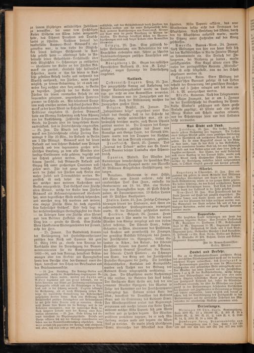 Belgien. Brüssel, 24. Januar. Die „Independance belge“ verzeichnet unter Vor⸗ behalt das Gerücht, daß in der Schlacht bei Kassongo, welche mörderischer war, als ur⸗ sprünglich berichtet wurde, auch Baron Dhanis getödtet worden sei. Die Truppen des Congo— staates geriethen zwischen das Feuer von Rumaliza und Gongo Lutete, der Verrath übte. Lutete wurde von den Truppen der Nachhut, welche ihn bei dem Verrath ertappten, getödtet. Frankreich. Paris, 25. Januar. Das „Journal des Debats“ meldet aus St. Louis: Oberst Bonnier besetzte Timbuktu ohne Schwert— streich.