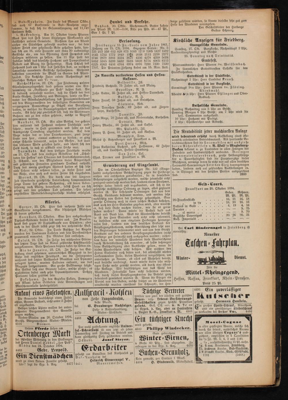 Kirchliche Anzeigen für Friedberg. Evangelische Gemeinde. Samstag, 27. Okt. Burgkirche, Nachmittags 2 Uhr, Vorbereitungspredigt und Beichte 23. Sonntag nach Trinitatis. Erntefest. Pfarramtswoche: Herr Pfarrer br. Weiffenbach. In sämmtlichen Gottesdiensten Collekte für den Stadtkirchenbau. Gottesdienst in der Stadtkirche. Nachmittags 2 Uhr: Herr Candidat Krauß. Gottesdienst in der Burglirche. Vormittags 9⅛ Uhr: Herr Pfarrer Dr. Flöring. Abendmahl. Abends 5½ Uhr: Herr Pfarrer Eßlinger aus Ober— Rosbach.