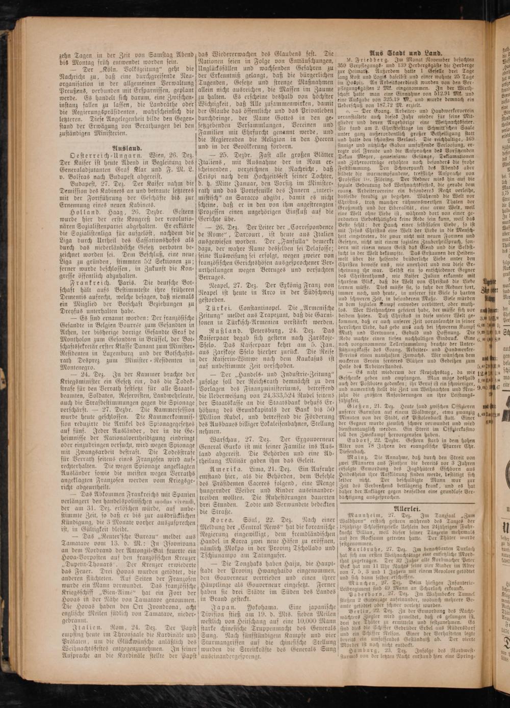 Gießen, 21. Dez. Heute fand zwischen Offizieren unserer Garnison auf einem Waldwege, etwa zwanzig 0 Einer der Gegner wurde ziemlich schwer verwundet und wird dienstuntauglich werden. Ein Streit im Offizierkasino soll den Zweikampf hervorgerufen haben. 0