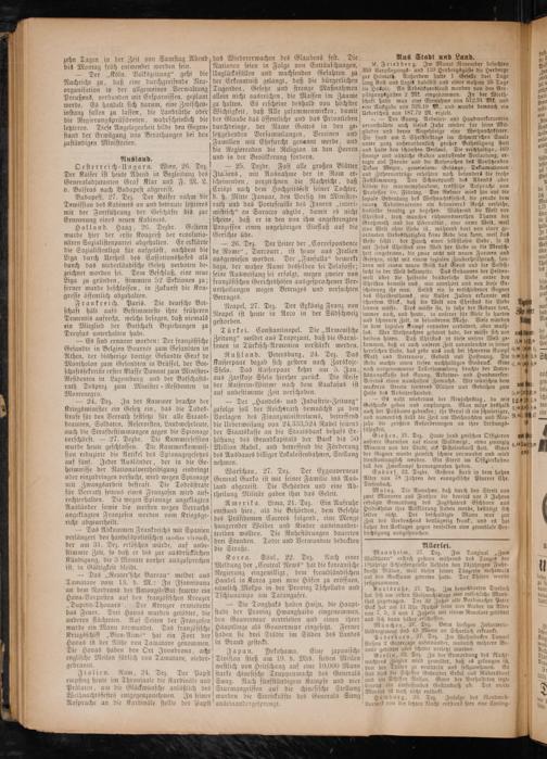 Warschau, 27. Der Exgouverneur General Gurko ist mit seiner Familie ins Aus— land abgereist. Die Behörden und eine Ab- [theilung Militär gaben ihm das Geleit. Amerika. Lima, 21. Dez. Ein Aufruhr