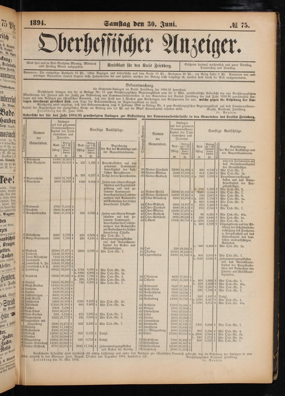 Nachstehend bringen wir die in Beilage Nr. 17 zum Großherzoglichen Regierungsblatt vom 22. d. Mts. veröffentlichte Uebersicht der von Großherzoglichem Ministerium des Innern und der Justiz zur Bestreitung von Communalbeduͤrfnissen in den Gemeinden des Kreises Friedberg für das Jahr 1894/95 genehmigten Um⸗ lagen mit dem Anfügen zur öffentlichen Kenntniß, daß eine Frist von 4 Wochen zum Vorbringen von Beschwerden bei uns, welche gegen die Erhebung der Um⸗ lagen überhaupt gerichtet sind, vom Tage der Bekanntmachung im Regierungsblatt an läuft.