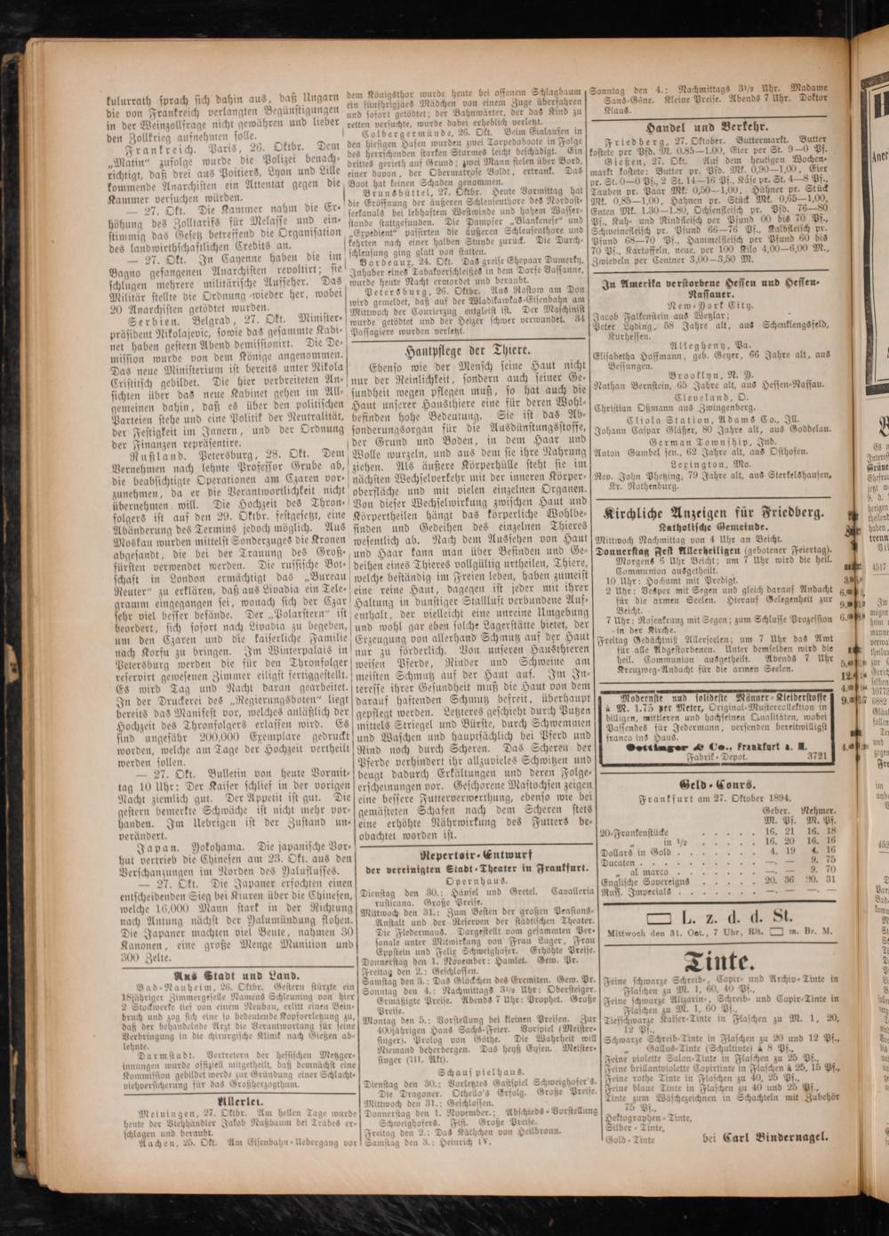 1 und solideste Männer ⸗Kleiderstoffe u M. 1.75 per Meter, Original-Mustercollektion in billigen, mittleren und hochseinen Qualitaten, wobei Pass ndes für Jedermann, versenden bereitwilligst franco ins Haus. l— 9., Frankfurt 4. l. Fabrik epot 3721 Geld- Cours. im Frankfurt am 27. Oktober 1894. anb g 0 Geber. Nehmer. 2 M. Pf. M. Pf. 20 Frankenstücke 186. 1 in ½ 16. 20 480 Dollars in Gold 1898 5 Ducaten i 9. 75 „ al marco 2 9. 70 Englische So vereigns 20. 86 0. 31 7 Russ. Imperials— Par a Das. 7 i 1 lomn L. Z. d. St. M Mitwoch den 81. Oct., 7 Uhr, Rlt. EI m. Br. M. St S0 „* Tinte 5 * 1 5* Felt Schreib-, Copir- und Archiv- Tinte in 0 . 1 8 7 und Copir⸗Tinte in dale zu M. 1, 20 zer g
