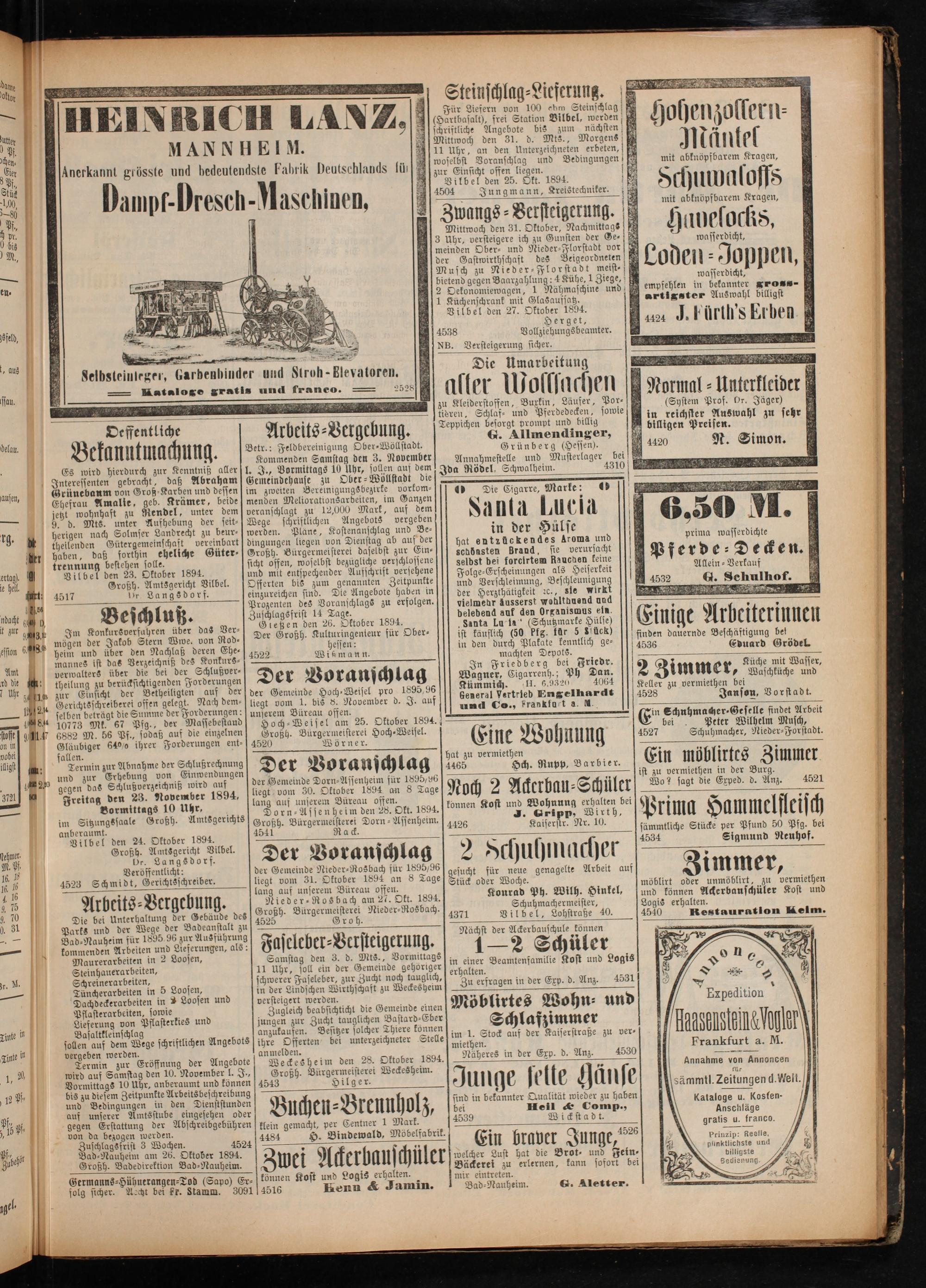 gegen Erstattung der Abschreibgebühren von da bezogen werden. Zuschlagsfrist 3 Wochen. 4524 Bad⸗Nauheim am 26. Oktober 1894. Großh. Badedirektion Bad⸗Nauheim.