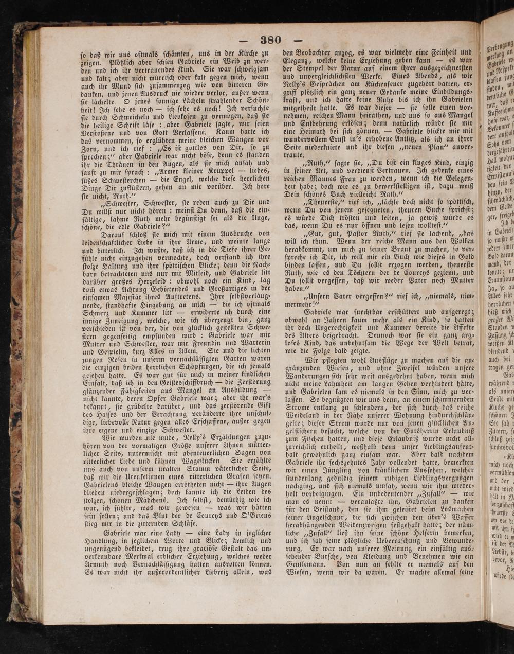 Wir wurden mie müde, Nelly's Erzählungen zuzu⸗ hören von der vormaligen Größe unſerer Ahnen mütter— licher Seits, untermiſcht mit abenteuerlichen Sagen von ritterlicher Liebe und kühnen Wageſtücken. Sie erzählte uns auch von unſerm uralten Stamm väterlicher Seite, daß wir die Urenkelinnen eines ritterlichen Grafen ſeyen. Gabrielens bleiche Wangen errötheten nicht— ihre Augen blieben niedergeſchlagen; doch kannte ich die Leiden des ſtolzen, ſchönen Mädchens. Ich ſelbſt, demüthig wie ich war, ich fühlte, was wir geweſen— was wir hätten ſein ſollen; und das Blut der de Courcys und O'Briens ſtieg mir in die zitternden Schläfe.