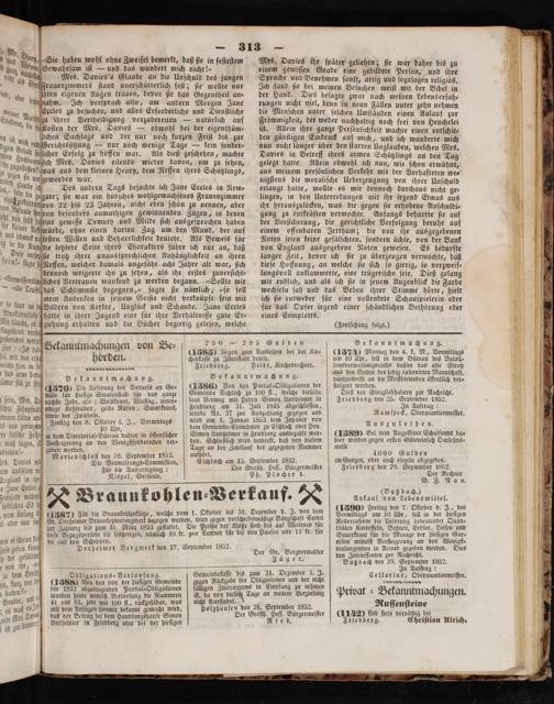 (1586) Von den Partial⸗Obligationen der Gemeinde Eichloch zu 100 fl., welche dieſelbe laut Vertrag mit Herrn Simon Lindheimer in Friedberg am 31. Juli 1845 abgeſchloſſen, wurde No. 37 zur Auszahlung gezogen und wird am 1. Januar 1853 dem Inhaber von dem Gemeinde⸗Einnehmer zu Eichloch oder Hrn. Simon Lindheimer in Friedberg gusbezahlt wer⸗ den. Schließlich wird bemerkt, daß von dieſem Tage an der Zinslauf der gezogenen Nummer aufhört. Eichloch am 15. September 1852. Der Großh. Heſſ. Bürgermeiſter Ph. Plocher J.