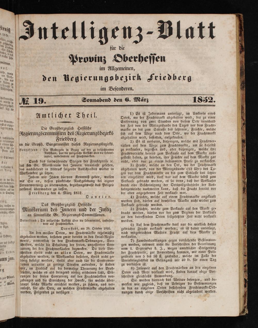 Betreffend: Die polizeiliche Aufficht über die Lebensmittel, insbeſon⸗ dere auf Fruchtmärkten. Darmſtadt, am 28. October 1846. An den meiſten Orten, wo Fruchtmärkte regelmäßig abgehalten werden, beſtehen zwar bereits in den Local-Regle⸗ ments, namentlich in den Fruchtmarkt⸗Ordnungen, Vor⸗ ſchriften, welche die Erhaltung der freien, ungeſtoͤrten Con— currenz bei den Fruchtverkäufen bezwecken. Da dieſe Vor— ſchriften theils nicht an allen Orten, wo Fruchtmärkte abgehalten werden, in Wirkſamkeit beſtehen, theils nicht ge— hörig befolgt werden, theils aber auch für die Contraven⸗ tionen mitunter zu geringe Strafen androhen, ſo finden ir, im Hinblick auf die dermalige Theuerung der Brod— rüchte, welche es als dringend nöthig erſcheinen läßt, Stö— rungen der freien Concurrenz auf den Fruchtmärkten vor— zubeugen und die Erreichung der Zwecke, für welche über— haupt ſolche Märkte errichtet werden, zu ſichern, uns ver— anlaßt, für alle Orte, an welchen Fruchtmärkte abgehalten werden, Folgendes zu verfügen: